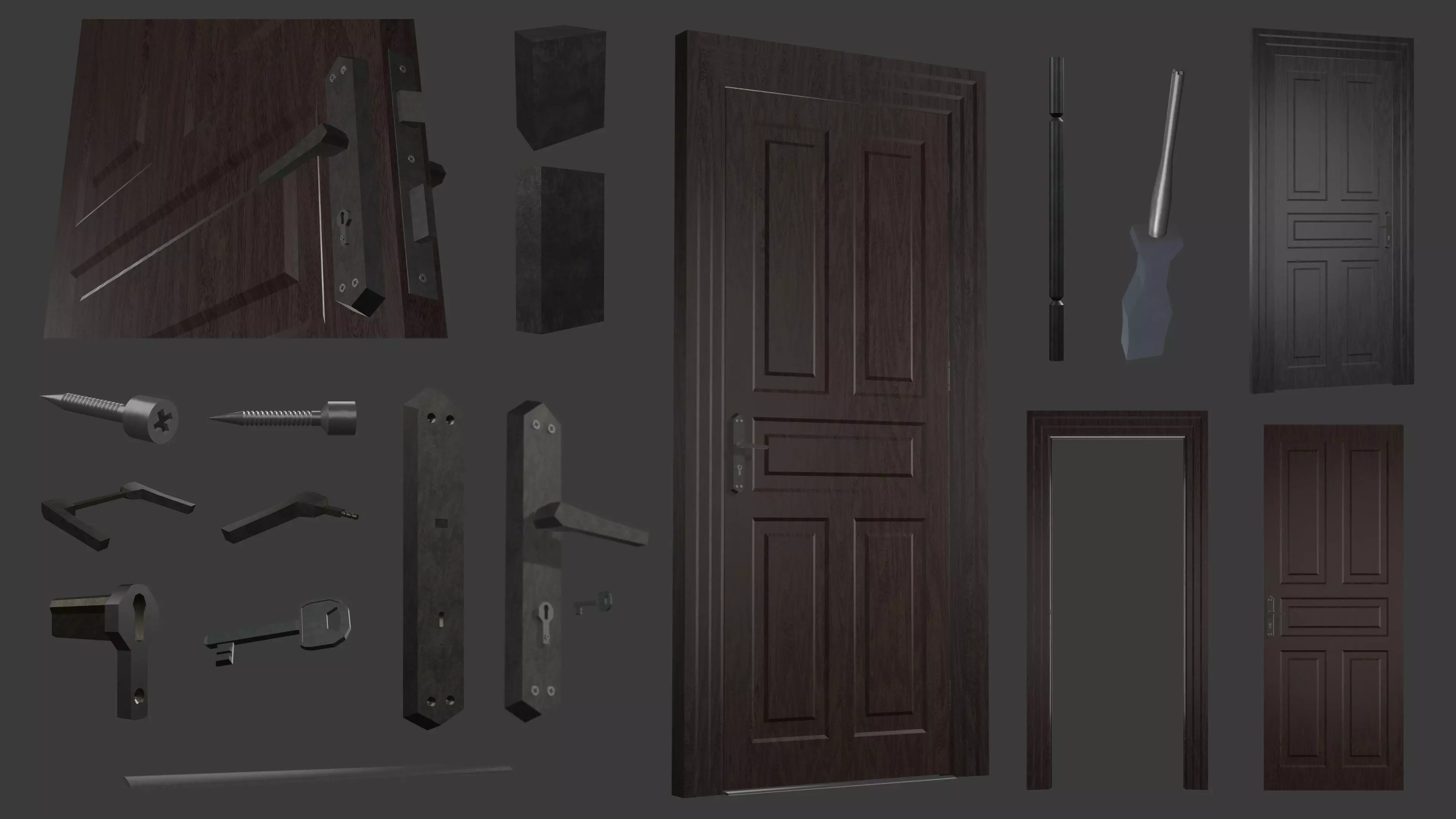 Additional models are included such as a door frame, two side locks, a key, a draft stopper, and a screwdriver.