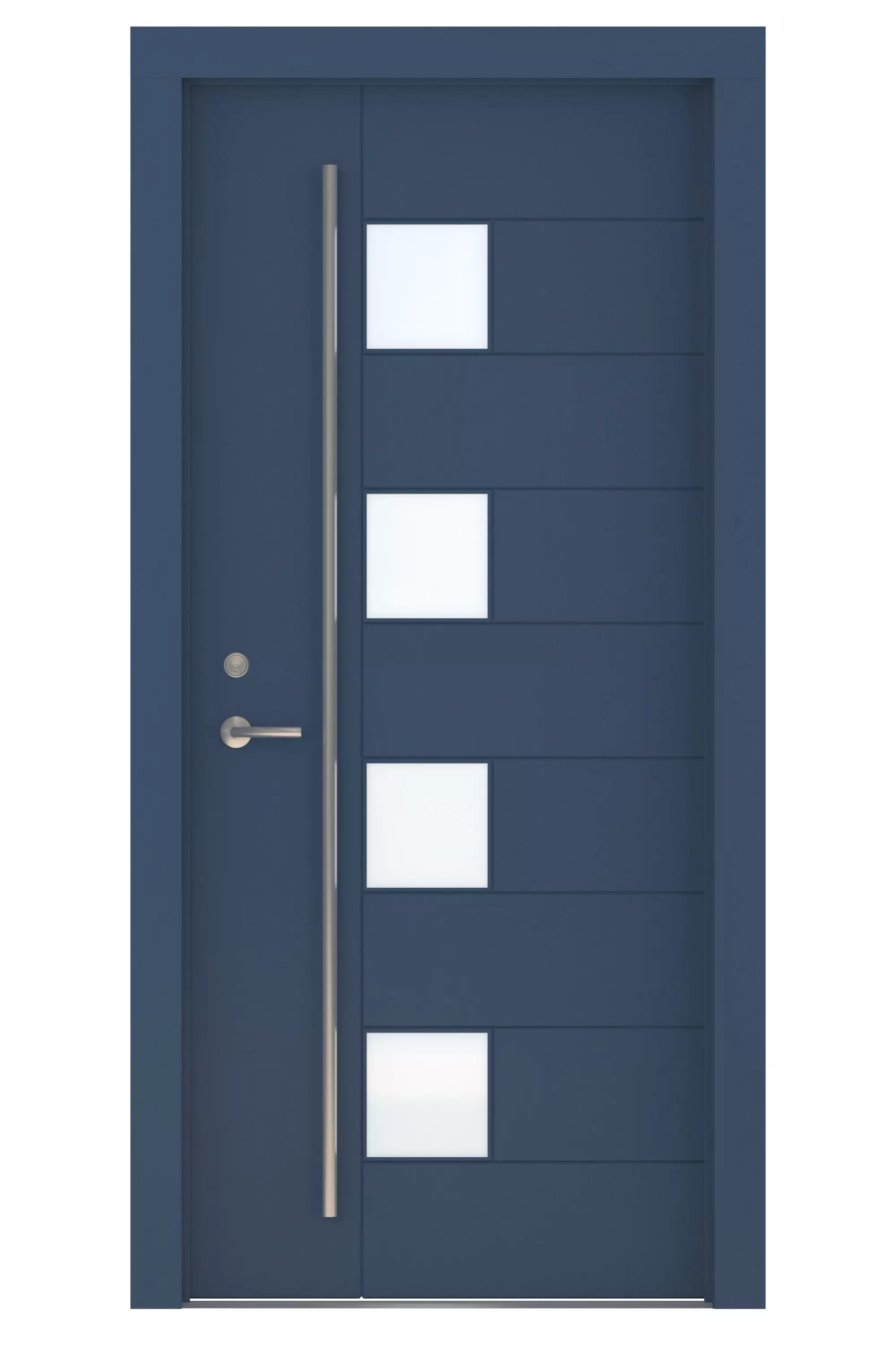 High Detail 3d Model of a modern Blue Wood Door with Frosted Glass Windows, Large Aluminum Door Pull and other hardware