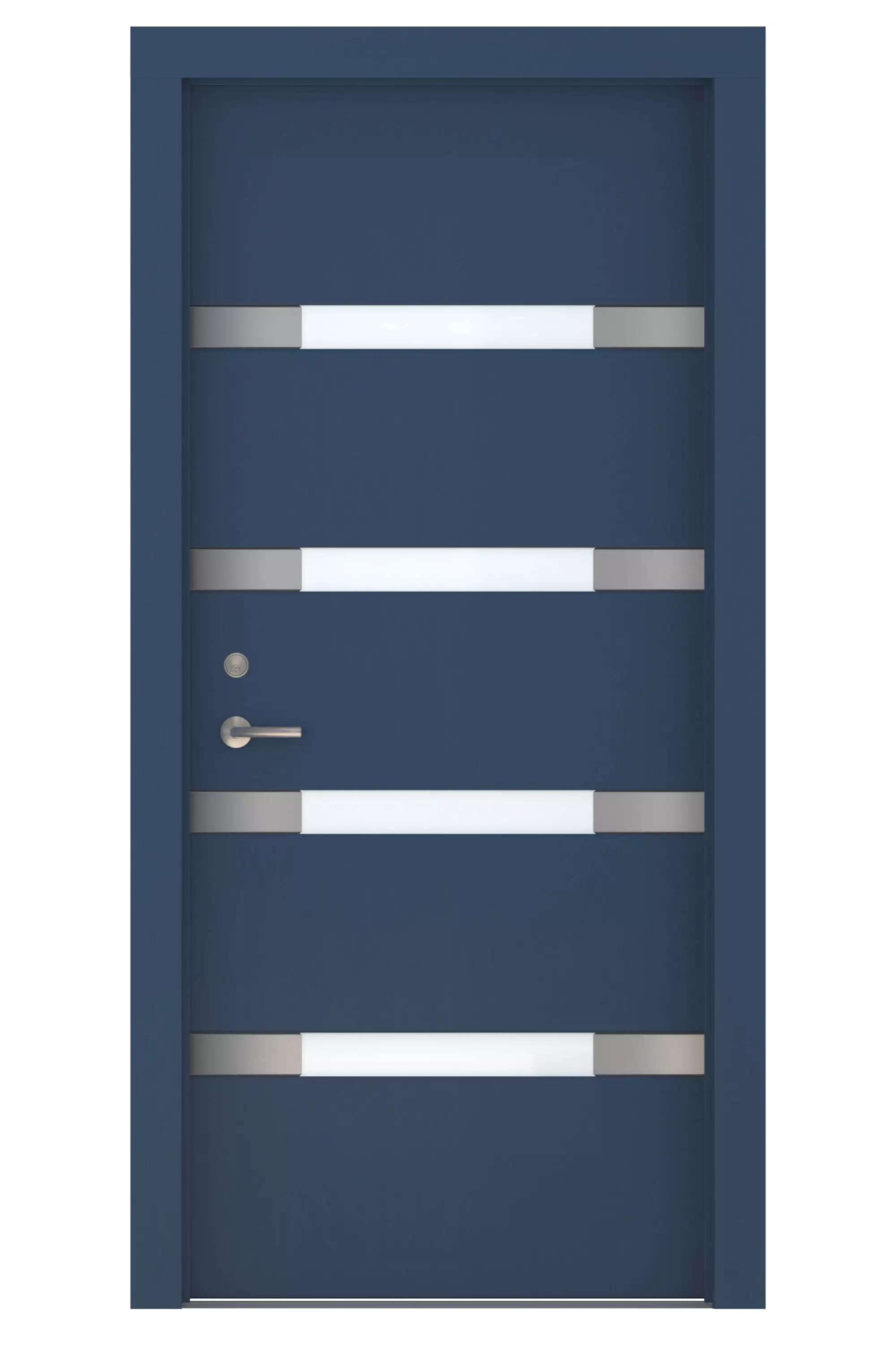 High Detail 3d Model of a modern Blue Wood Door with Frosted Horizontal Glass Windows and Aluminum Side Detail Strips, Large Aluminum Door Pull and other hardware included.