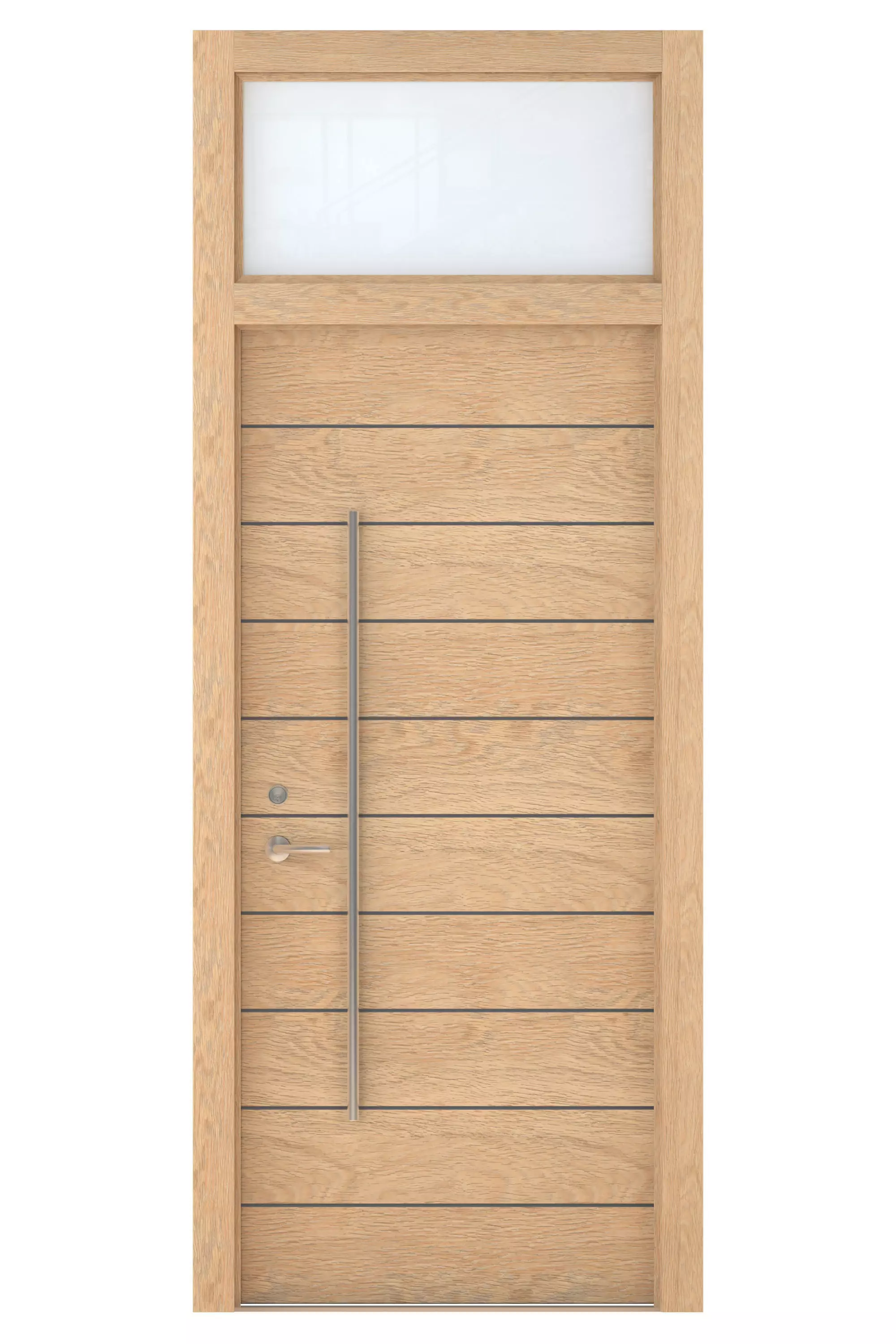 High Detail 3d Model of a modern Light Wood Door with Opaque Glass Transom Window Above. Door has Horizontal Detail Strips between panels, Large Aluminum Door Pull and other hardware included. Door wood grain can be seen.