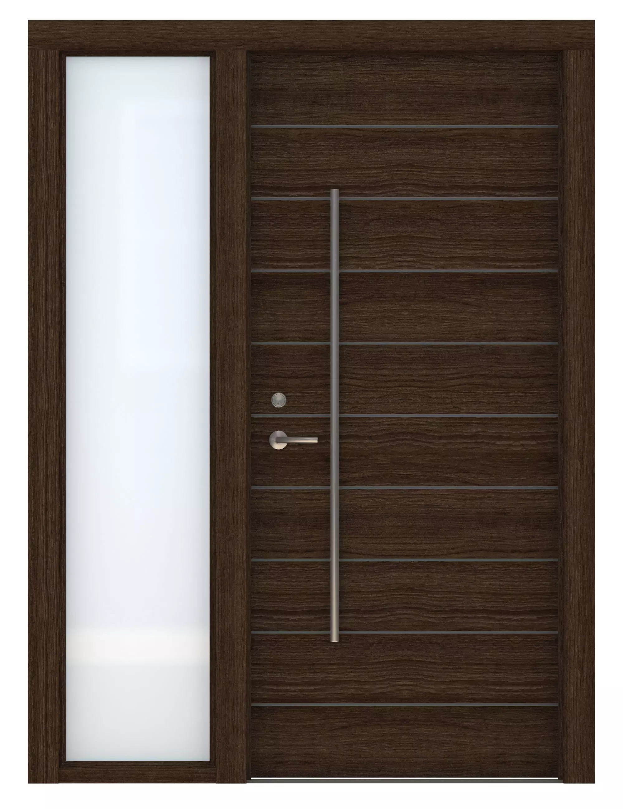 High Detail 3d Model of a modern Dark Wood Door with Opaque Glass Side Light on Left Side. Door has Horizontal Detail Strips between panels, Large Aluminum Door Pull and other hardware included. Door wood grain can be seen.
