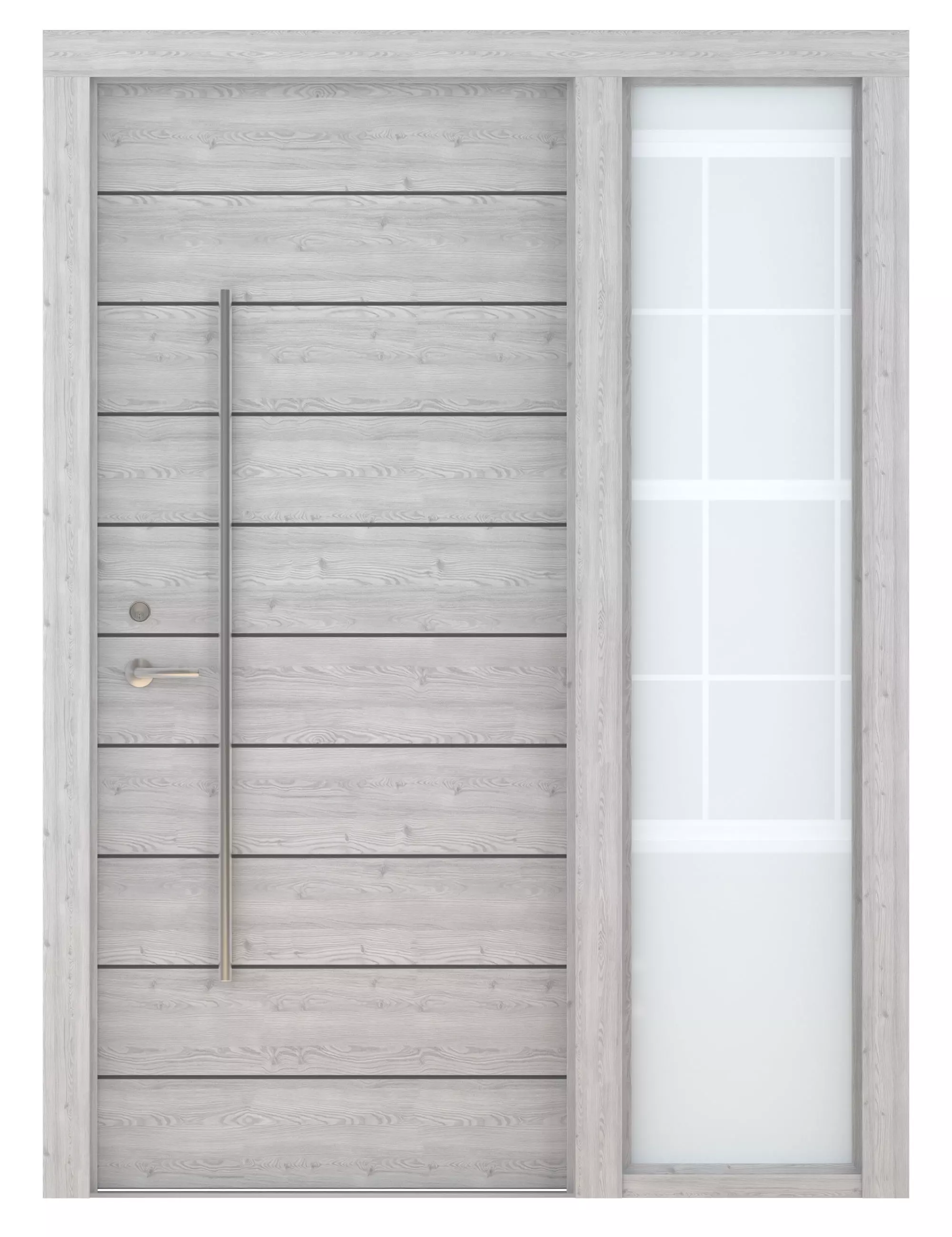 High Detail 3d Model of a modern Gray Wood Door with Opaque Glass Side Light on Right Side of Door. Door has Horizontal Detail Strips between panels, Large Aluminum Door Pull and other hardware included.