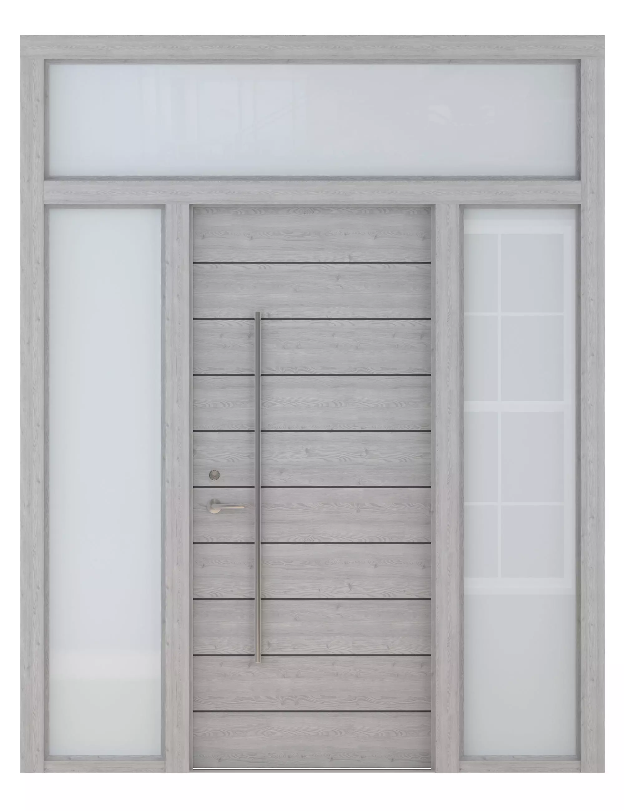 High Detail 3d Model of a modern Gray Wood Door with Opaque Glass Side Light on Left and Right Side of Door and Opaque Glass Transom Above Door. Door has Horizontal Detail Strips between panels, Large Aluminum Door Pull and other hardware included.