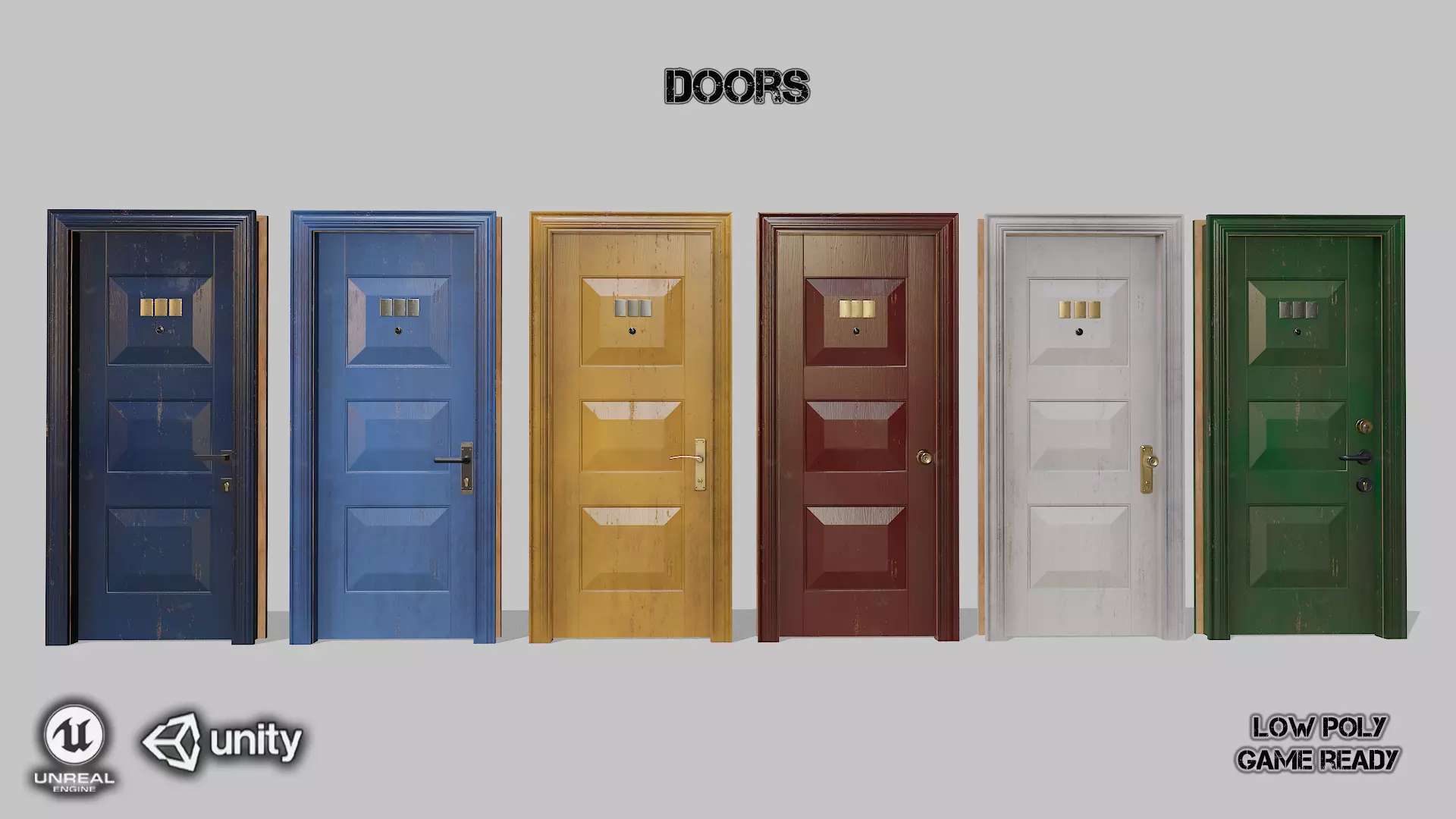 • 1 variants door of the Low poly model. And 14 types of door hardware.