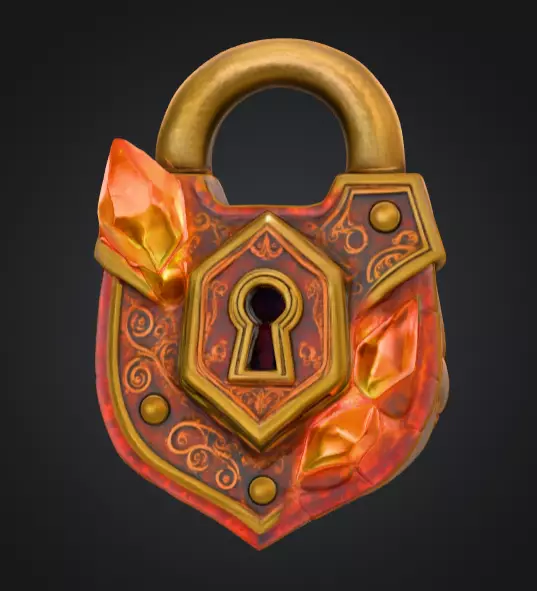 The lock carries a sense of age and history, with textures that showcase slight wear, tarnish, and metallic resilience. Its glowing ember effect adds an otherworldly charm, making it ideal for magical worlds, treasure vaults, or enchanted gates. Perfect for use in fantasy games, cinematic environments, or concept art, this lock embodies the essence of mystery and strength.