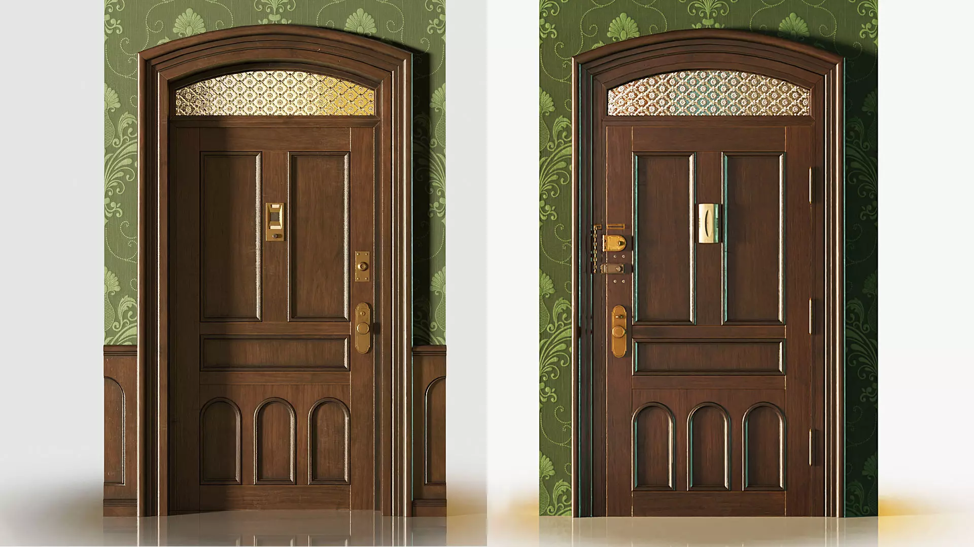 This 3D model represents a vintage-style entrance door, with a carefully crafted design inspired by a historical setting. Made of dark wood with molding and metal details, this door reflects the elegance of classic architecture. On the exterior side, there is a metal plate with a central peephole, while the interior side includes brass locks, a security chain, and a central intercom. The door is topped with a semicircular window featuring textured glass, adding a touch of authenticity and ambient light. Ideal for architectural visualization projects, historical set designs, or vintage environments in games and films.