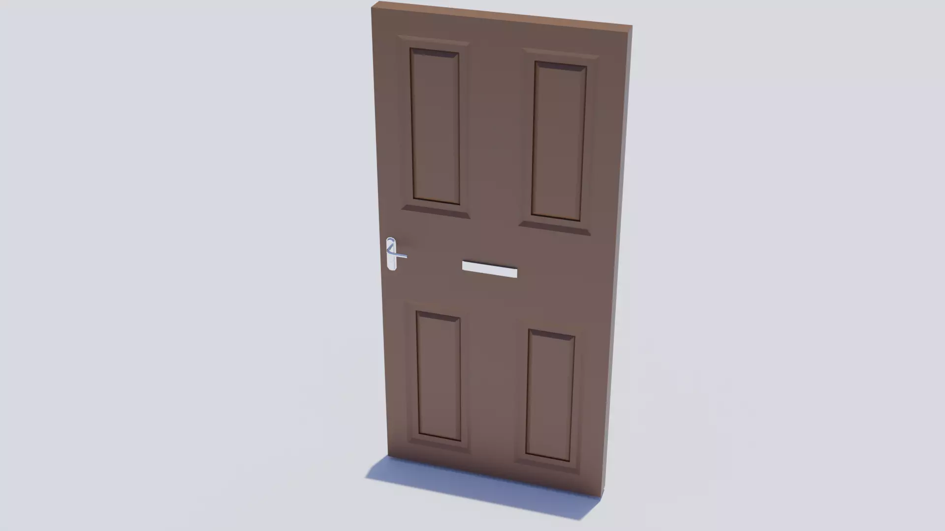 This is a royalty free 3d model of a wooden door with a metal handle and letterbox. It is pivoted to one side so it rotates correctly as if it were on a hinge. The materials are attached as they are simple colours. If you enjoy this, please leave a like and a comment. Feel free to get in contact for projects and depending on the complexity of the project, it could be done for free. Thanks!