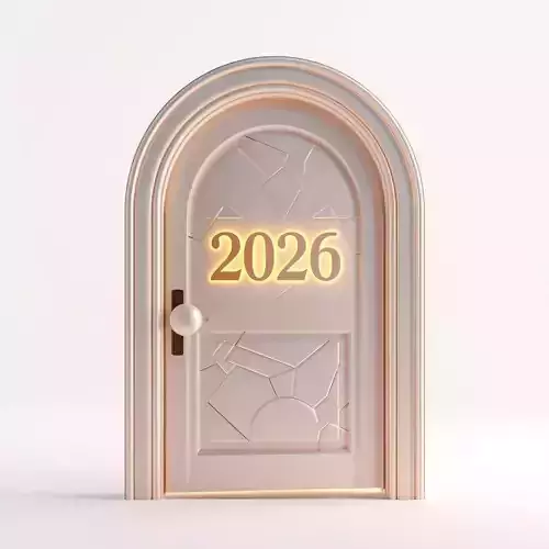 Tagsnew year, 2026, door, arched, celebration, festive, holiday, white, gold, glowing, cartoon, stylized, symbolic, 3d model, geometric