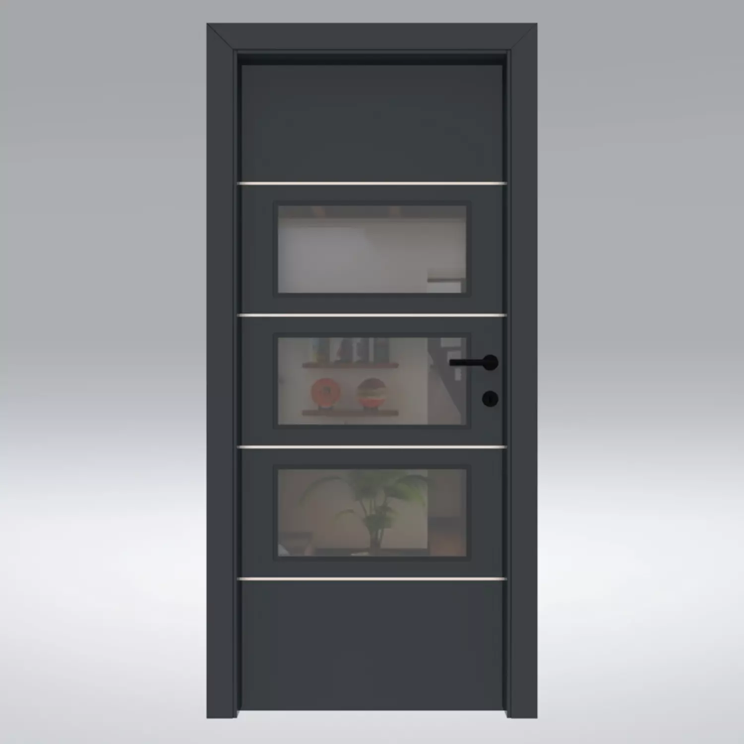 The perfect combination of luxury and Strength.Comes Assembled or in parts. Door have 3 glass matted or frosted panels with 4 inox lines as decoration.Materials: wood, inox, matted glass, painted glass, MDF and aluminium.