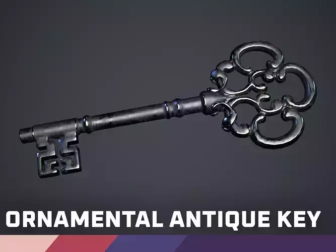 This high-quality 3D model represents a vintage metal key with an ornate, baroque-inspired design. The bow features elaborate scrollwork, giving the key a sense of historical elegance and craftsmanship. The shaft is slightly worn, suggesting age and use, while the bit includes a complex, symmetrical cut ideal for fantasy or period environments.