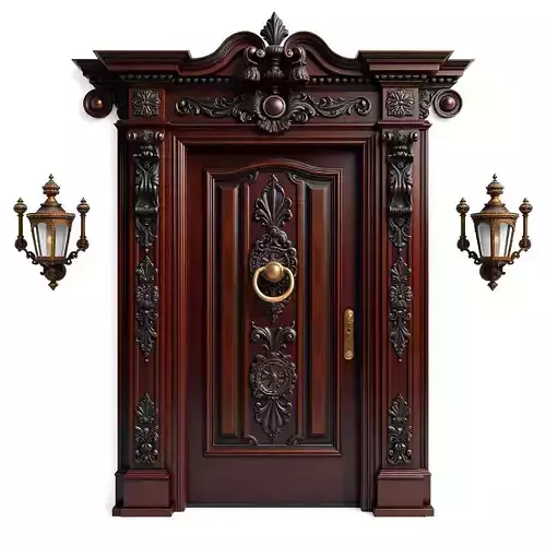This exquisite 3D model presents a highly ornate, grand entrance door set, meticulously crafted in a distinct Victorian or Baroque style. The central feature is a rich, dark wooden door adorned with complex, hand-carved details, a decorative frame, and an eye-catching brass knocker. This model is perfect for elevating the visual fidelity of architectural visualizations (Arch-Viz), historical reconstructions, luxury interior/exterior scenes, and high-fidelity game environments where intricate detail is paramount. It is also well-suited for film and animation projects requiring a touch of classical grandeur, as well as high-end virtual and augmented reality (AR/VR) experiences. The package includes two beautifully designed vintage-style wall lanterns, complementing the door's aesthetic and providing ambient lighting solutions. The model boasts clean topology, is professionally UV unwrapped, and comes with high-resolution PBR (Physically Based Rendering) textures for realistic material representation of the dark wood, aged brass, and detailed metallic accents. It is prepared for seamless integration into various 3D pipelines, supporting common formats like GLB, OBJ, FBX, USD, DAE, ABC, and PLY. While highly detailed, it is optimized for efficient rendering in both real-time applications (with appropriate poly budget) and static scene compositions, ensuring photorealistic results. The intricate detailing makes it an ideal asset for adding a touch of timeless elegance and historical charm to any digital project.