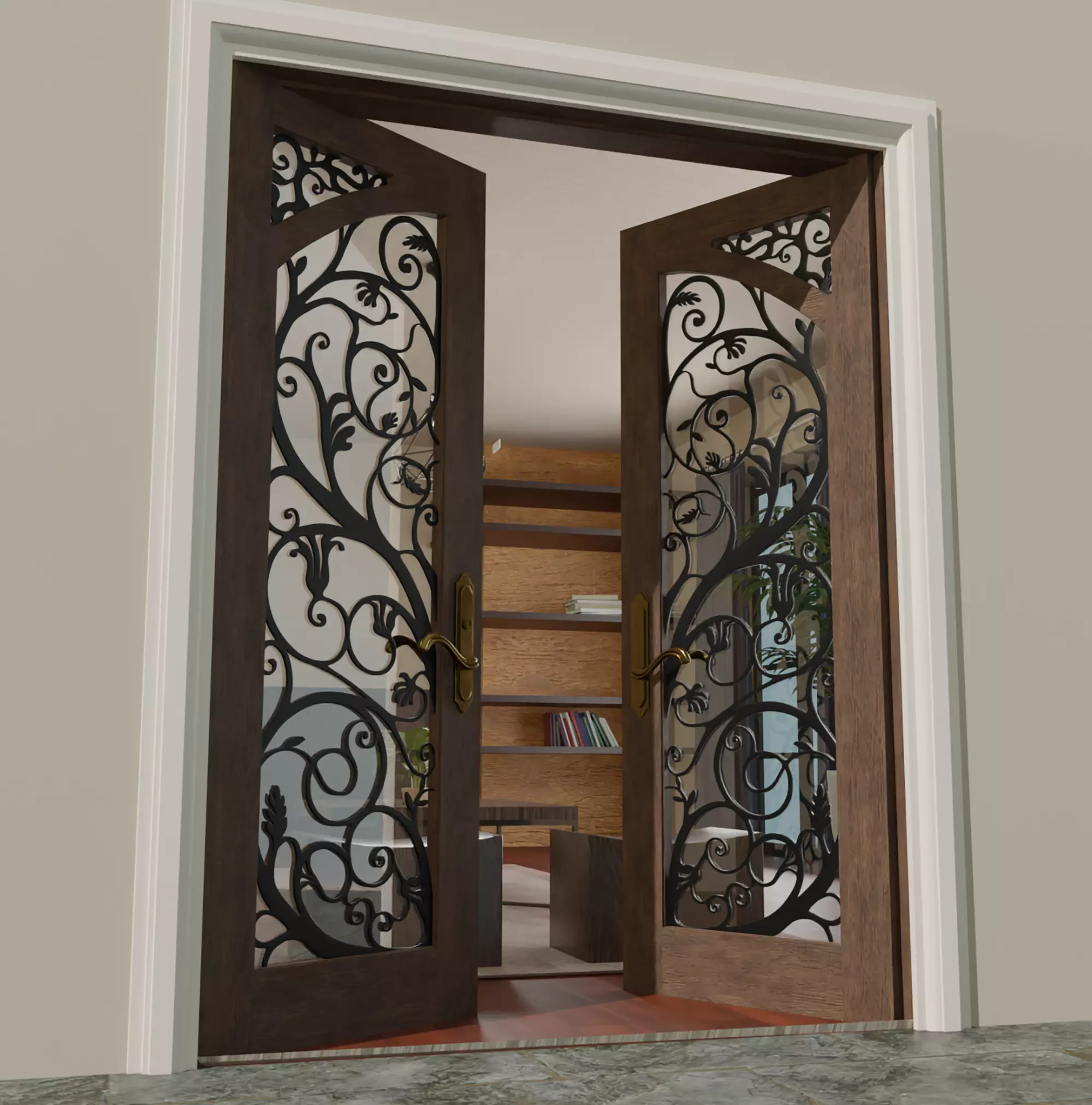 Classic Spanish Double swing Main door Featuring original intricate Art Noveau design of metal grilles Door panel dimensions: 0.90 x 2.40 meters per panel Real world scale used.