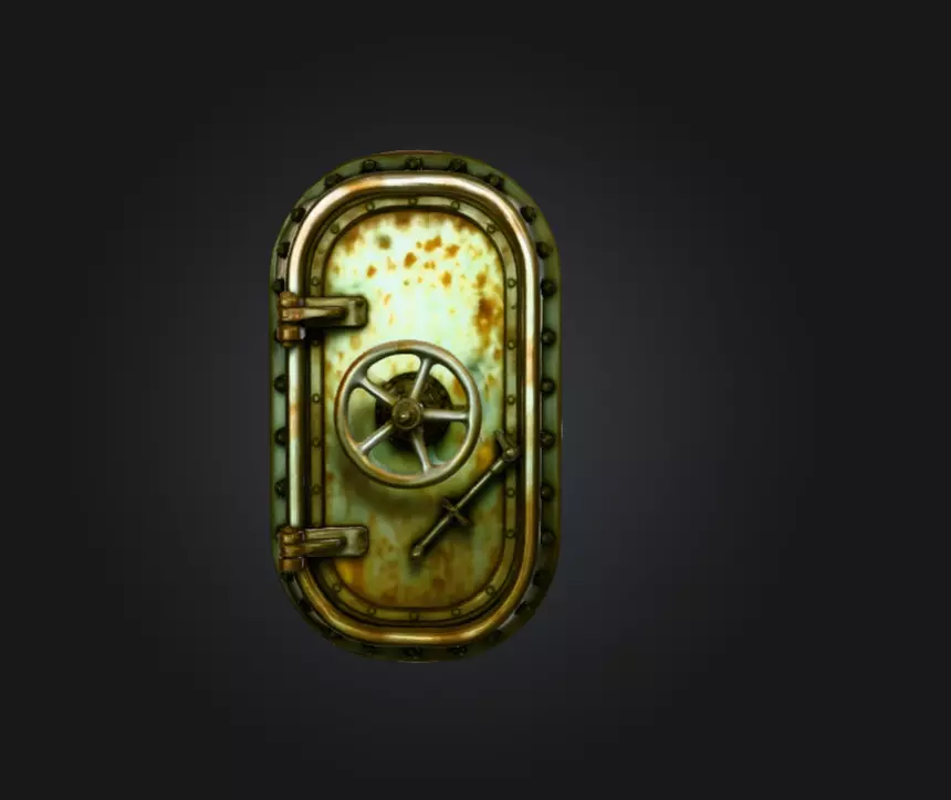 At the center of the hatch is a large mechanical wheel lock, modeled with precision to replicate the manual sealing systems used in underwater vessels. The wheel’s metallic textures show signs of age and corrosion, while the secondary locking bar adds an extra layer of realism and mechanical complexity. The surface of the hatch is marked with rust patterns, worn paint, and subtle grime buildup, giving it an authentic sense of long-term exposure to moisture, salt, and the challenging conditions of deep-sea navigation.