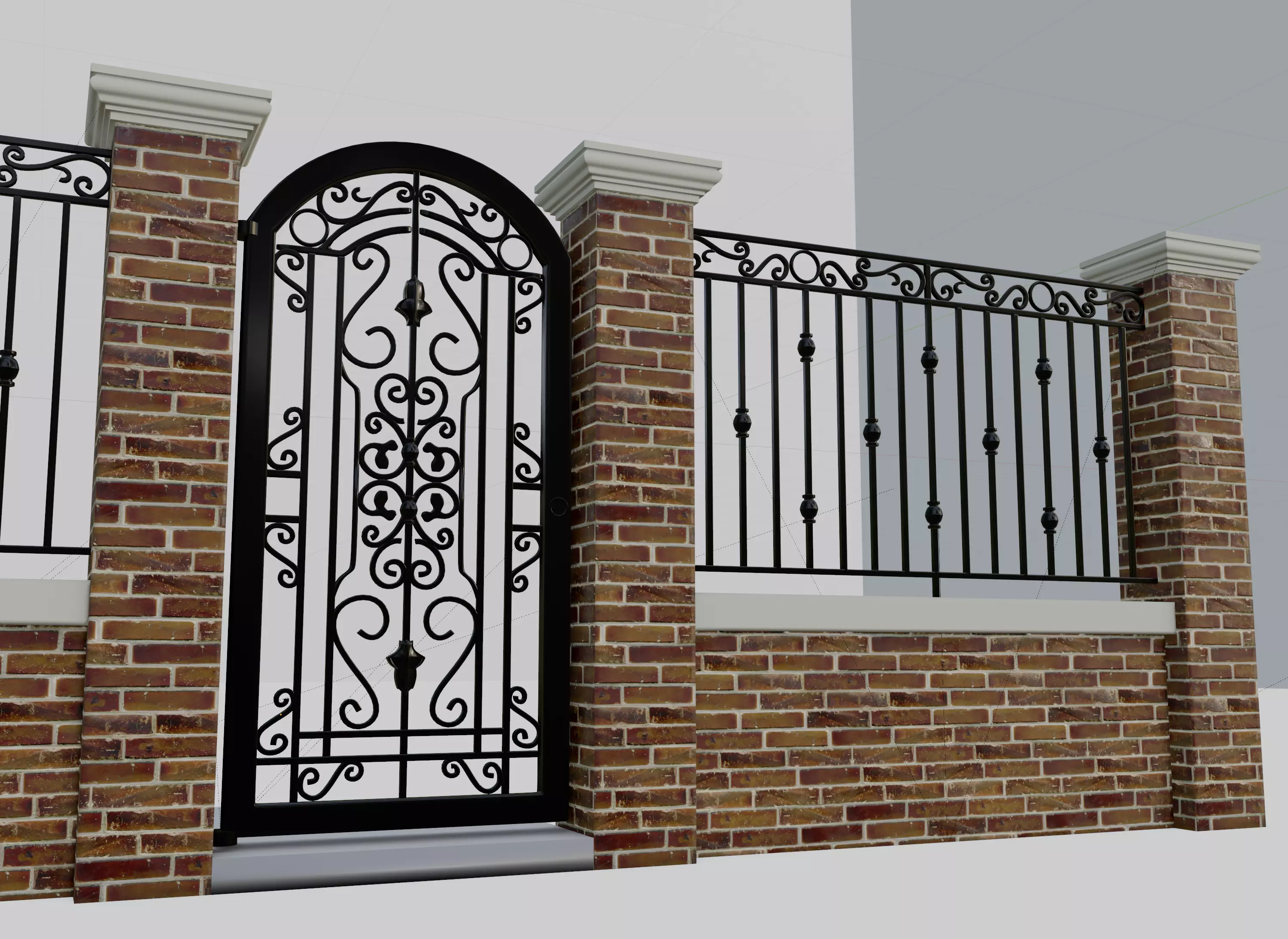 Classic Swing Gate and Fence Featuring original intricate classic wrought Iron design of metal grilles with brick wall and plaster Moldings Door panel dimensions: 0.90 x 1.85 meters panel Real world scale usedModel and GeometryGeometry count before subdivisionModel objects can be subdivided, you can add subdivision data when importing fbx if you want subsurf. Geometry is made of quads All parts correctly named.