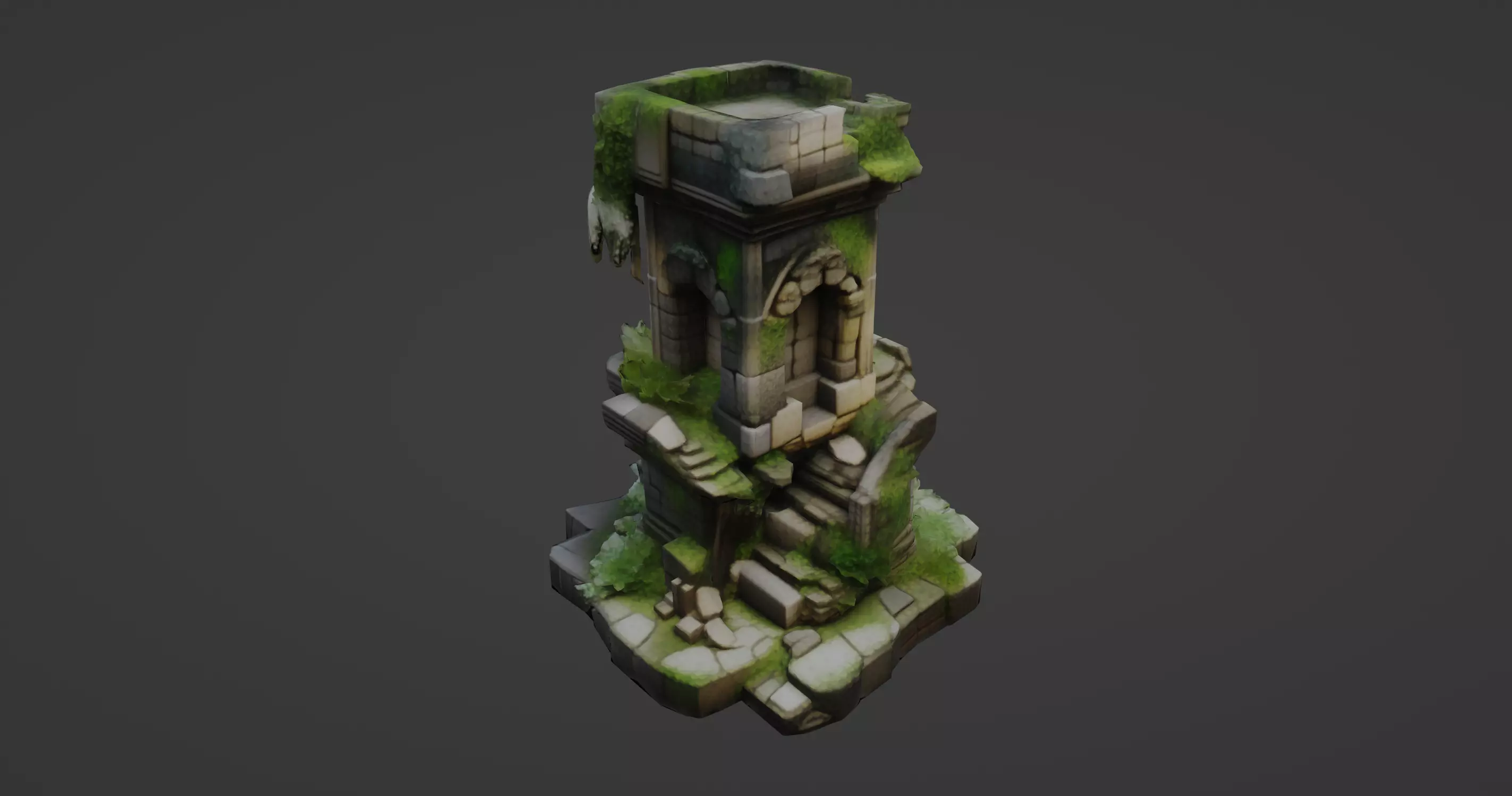 This detailed 3D model showcases an ancient collapsed watchtower, worn by time and overrun by nature. The structure features weathered stone blocks, beautifully textured with realistic cracks, chips, and erosion that speak to centuries of abandonment. Moss and ivy trail down the sides, growing through the fractures of the architecture, enhancing its mystical, lost-world appearance.The tower stands partially intact, its broken staircase and crumbling platform suggesting a past of strategic significance—possibly once a lookout or a sacred place. The model captures dramatic lighting and surface wear that highlight the carved arches and architectural flourishes, ideal for fantasy or medieval settings in visual storytelling or gaming.Every detail has been carefully sculpted and textured to ensure realism at close range, with aged surfaces and foliage integrated seamlessly into the ruins. This creates an immersive sense of history and decay, making it a perfect asset for scenes requiring a rich environmental narrative—whether in a forest, atop a cliff, or amidst a forgotten battlefield.This model is downloadable in .gmb format and includes the texture file. It is also available in .fbx format, making it suitable for integration in a wide range of 3D workflows, game engines, or rendering software.
