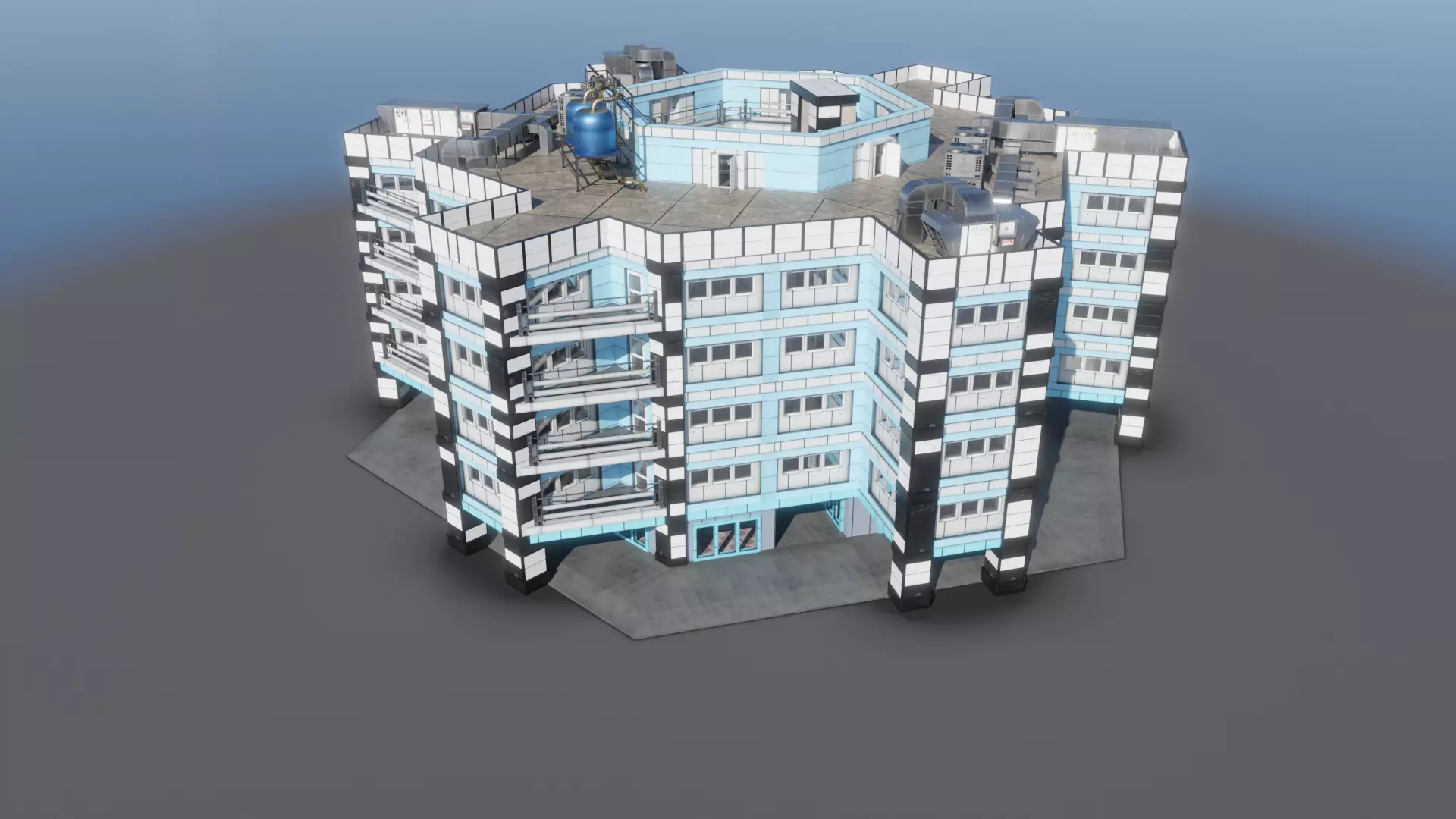 This is a residential building in a shape of gear/sprocket, blue building with black-white decoration. There is a roof with some armature, ventilation duct and some decoration. Each level consist of 6 flats with few rooms. There is a simple interior: walls, floor, ceiling, doors, windows. Inside of building is a hollow space with balcoony, staircase with handrails and elevator.All elements have textures : normal, difffuse, roughness (some object also mettalic) usually 2k.If you don't need interior, it's possible to delete interior parts (it is separate element). Feel free to change body or numbers of floors. You can adjust number of floors by copying whole segment.