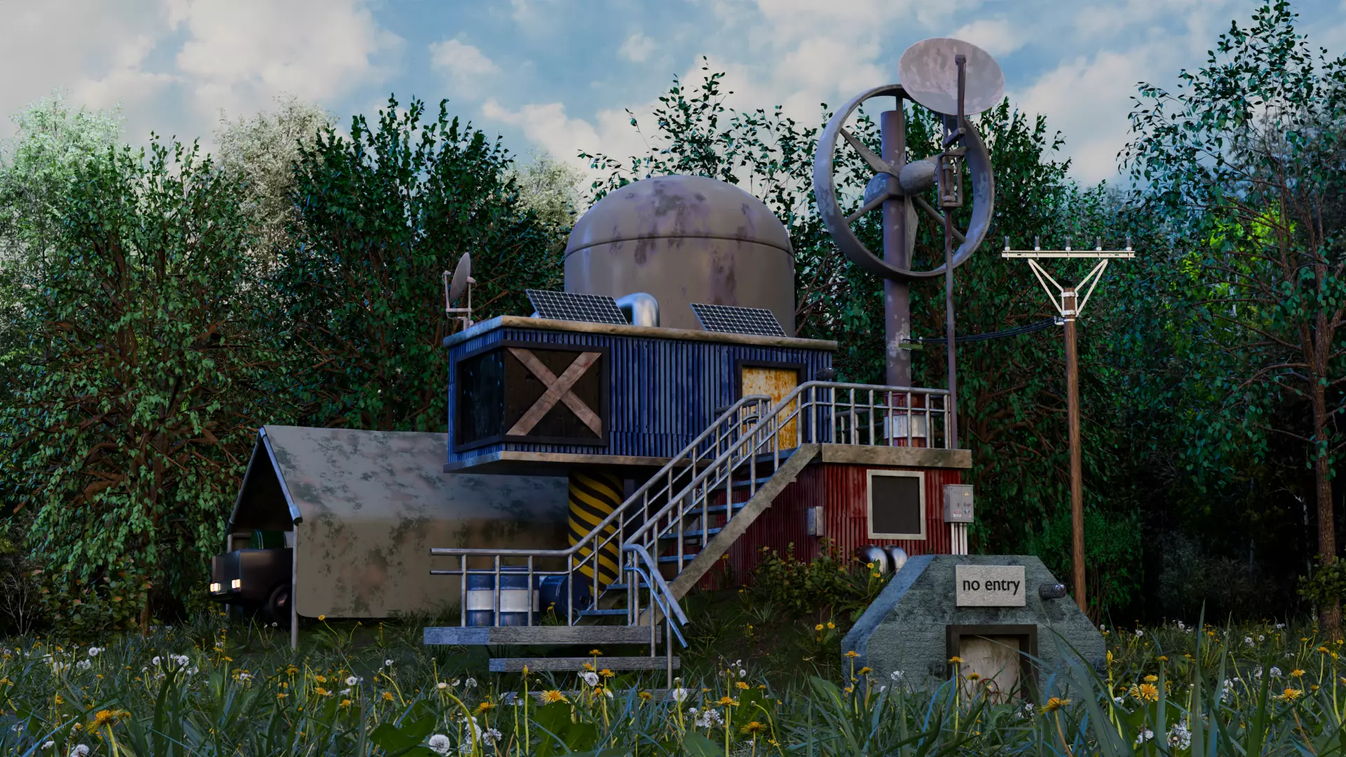 Main building: It is a two-level structure made of metal panels with blue and red coloring. The upper level is equipped with rooftop solar panels and various equipment.Dome: There is a large dome on the roof of the building, possibly used for storage or scientific purposes.Antenna and Instrumentation: A large antenna is visible to the right of the building, possibly for communications or scientific observations. There is also a satellite dish mounted on the roof.Entrance and Stairs: A metal staircase painted yellow and black leads to the main entrance, which may indicate a high-hazard area.No entry sign: In the foreground is a concrete block with a No entry sign, which means no entry for unauthorized persons.Attached Structure: To the left of the main building is a small structure covered by a metal shed. A piece of machinery or equipment with lights on is visible in front of it.Ambience: The station is surrounded by a dense forest, with flowers and grasses growing in the foreground, giving the scene a realistic feel and indicating the remote location of the station.The entire scene is rendered with a high level of detail, emphasizing the technological and scientific focus of the facility.