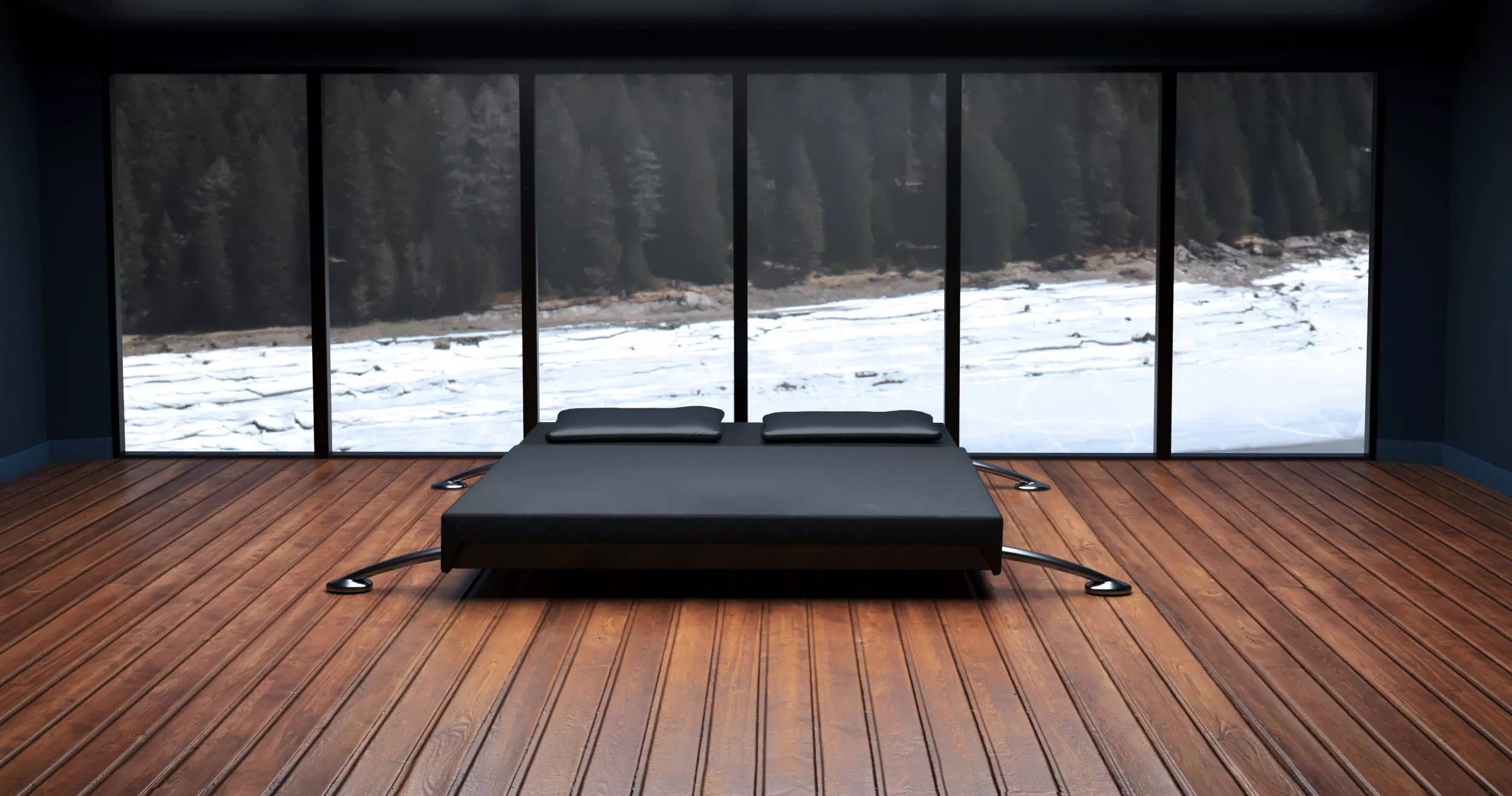 A cozy bedroom scene in 3ds Max with a modern and minimalist design.The focal point is a floor-to-ceiling window offering a stunning outdoor view.Bringing a calming balance between the interior and exterior.
