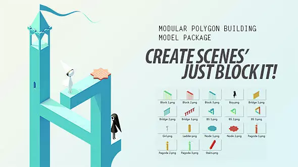 19 Base Polygon Modules:3 Automatic Animated Pagoda Models.3 Parallax Models (2 triangles, 1 quadrilateral).2 Character Models.1 Rainy Sea Automatic Animation Scene.10 Modules with Cloned Bridges and Stairs.10 Materials