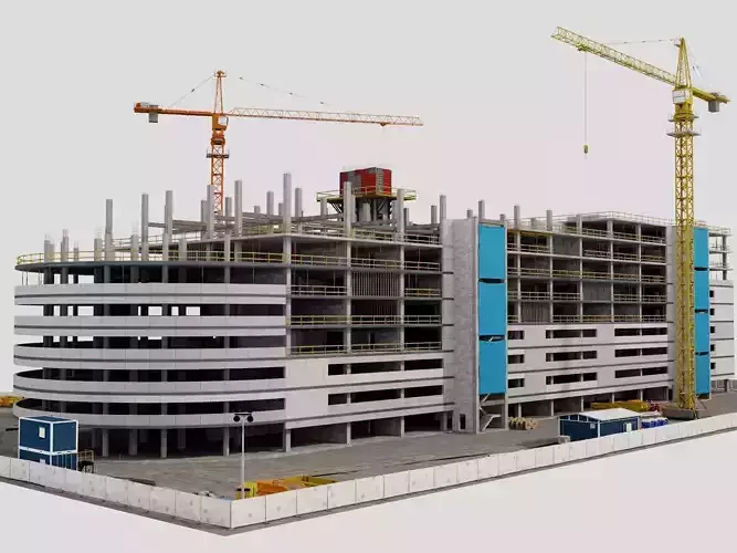 This 3D model of a construction site includes a multi-story concrete structure, cranes, scaffolding, building materials, fencing, and detailed site elements.