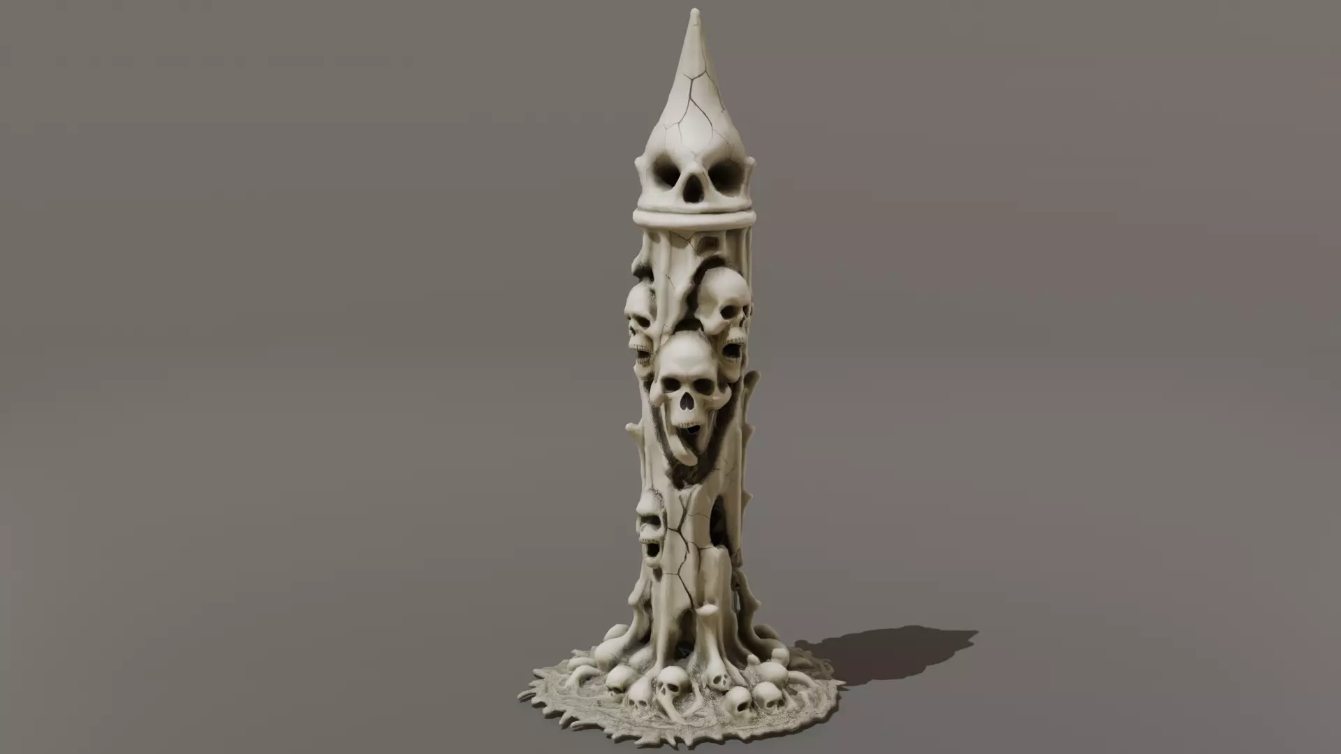 A towering obelisk featuring a menacing skull motif, designed to evoke ancient curses and dark rituals. This monument-style prop fits perfectly in dark fantasy, horror, or mystical environments such as cursed temples, forgotten ruins, or ritual grounds.