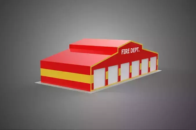 A Fire Station is generally divided into living/administrative quarters (the residential/office space for firefighters) and the Apparatus Bay. The Apparatus Bay is the primary functional space, characterized by its large, open interior and the distinctive oversized access points.