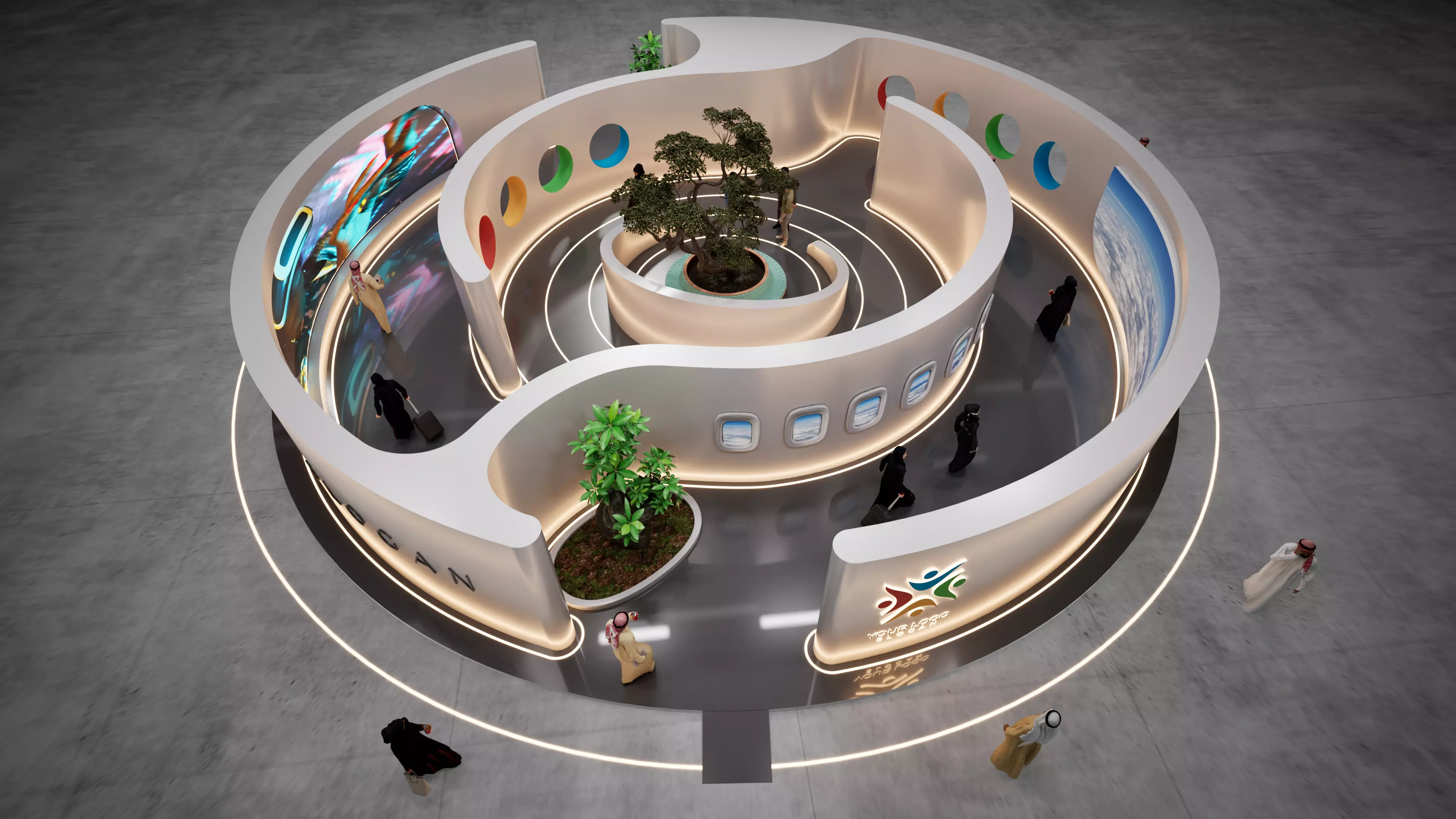 Real-Time Interactive Configuration | Trade Shows, Exhibitions & EventsSPIRALIS is a futuristic 3D exhibition pavilion designed as a continuous spiral maze, ideal for trade shows, exhibitions, expos, brand activations, and experiential events. The pavilion features a fluid circular geometry that naturally guides visitors through an immersive spatial journey, combining architectural design with digital interaction.