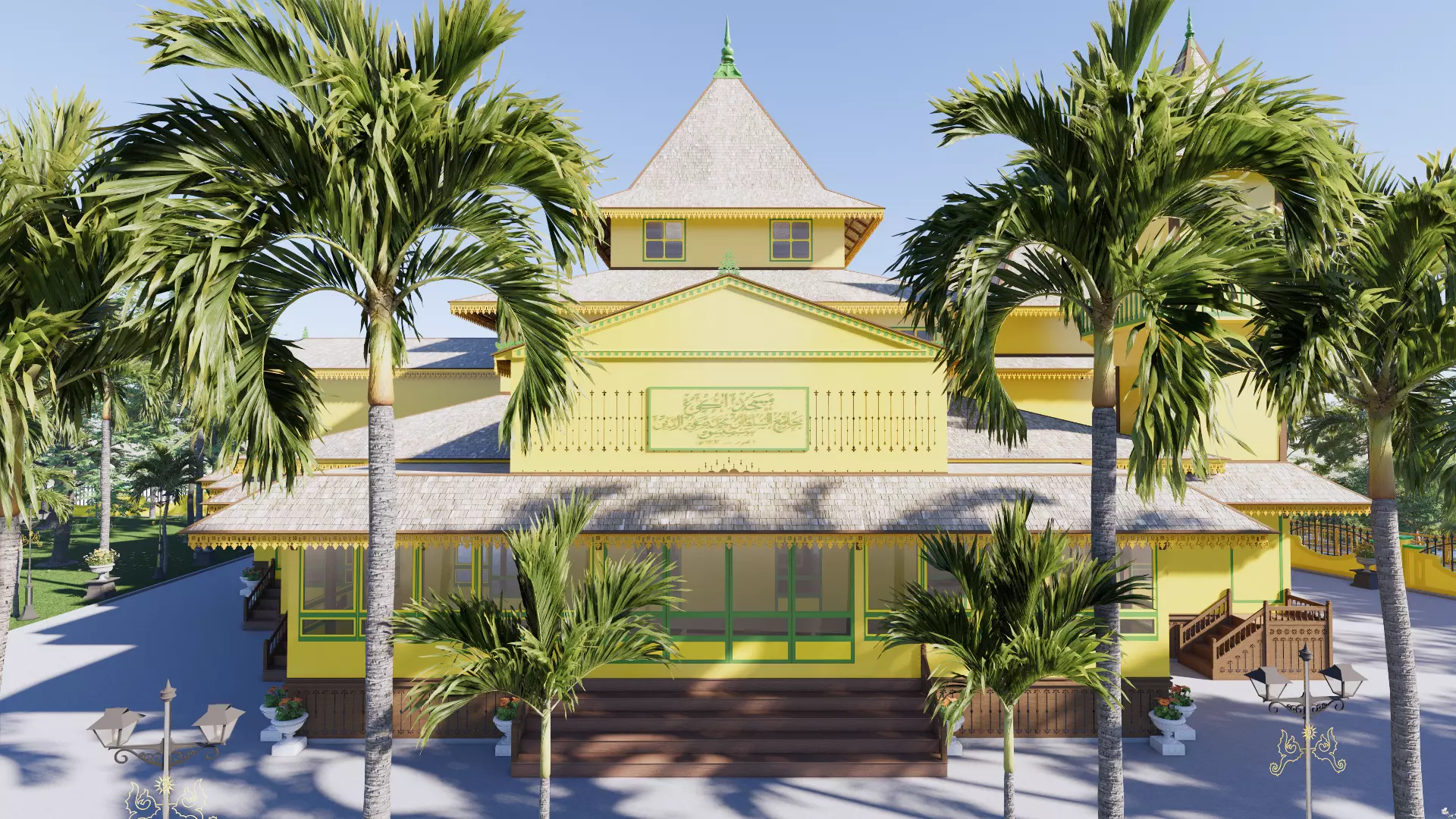 The Grand Mosque of Sultan Muhammad Tsyafiuddin II is one of the oldest mosques in West Kalimantan. It is located in the south of the palace courtyard facing the intersection of the Sambas River with access from the riverbank. This mosque was built on October 10, 1885 by Sultan Muhammad Tsyafiuddin II (the 13th Sultan) based on the vow of his mother, Ratu Sabar, to build a mosque. Although previously there was a place of worship in the form of a small mosque. Before this mosque was built, it was initially a small prayer room, the former home of Sultan Umar Aqamuddin I (the 3rd Sultan of Sambas), until finally it was built into the mosque that exists today. The mosque, which stands on a 60 x 40 meter plot of land, has a distinctive Malay architectural style. It was built with a stilt house model to avoid flooding, because the mosque is located facing a river. Architecturally, the Jami' Mosque of the Sambas Sultanate has a square plan consisting of 2 floors with a fairly large number of doors and windows. The 4-story roof with a rectangular peak space and a tapered crown on top, there are 2 towers on the left and right of the mihrab with the same roof shape. The materials used are almost 100% ironwood, including pillars, floors, walls, and roofs. The walls are painted yellow, the roof and fence under the building are brown. In 1975, renovations were carried out on the decayed pillars supporting the mosque and then wrapped in concrete. The Grand Mosque was designed using the Sketchup application and rendered using Enscape to produce a more realistic appearance. There are 6 layers of structural elements in the application so that it makes modeling easier and more detailed and neater. The textures and materials used are included in the SketchUp application. with that, everything shown in the preview image is included in the sketchup application which contains everything. This 3D model sketch can be converted into various applications such as fbx, obj, 3ds, blend, and others. This 3D model can be used for students, researchers, architects, civil construction, humanists and many others.For further questions, you can do this via the shop or Email : 3rd.summer.studio@gmail.com ; Whatsapp : +6289692630617 ; Instagram : 3rd_summerstudio