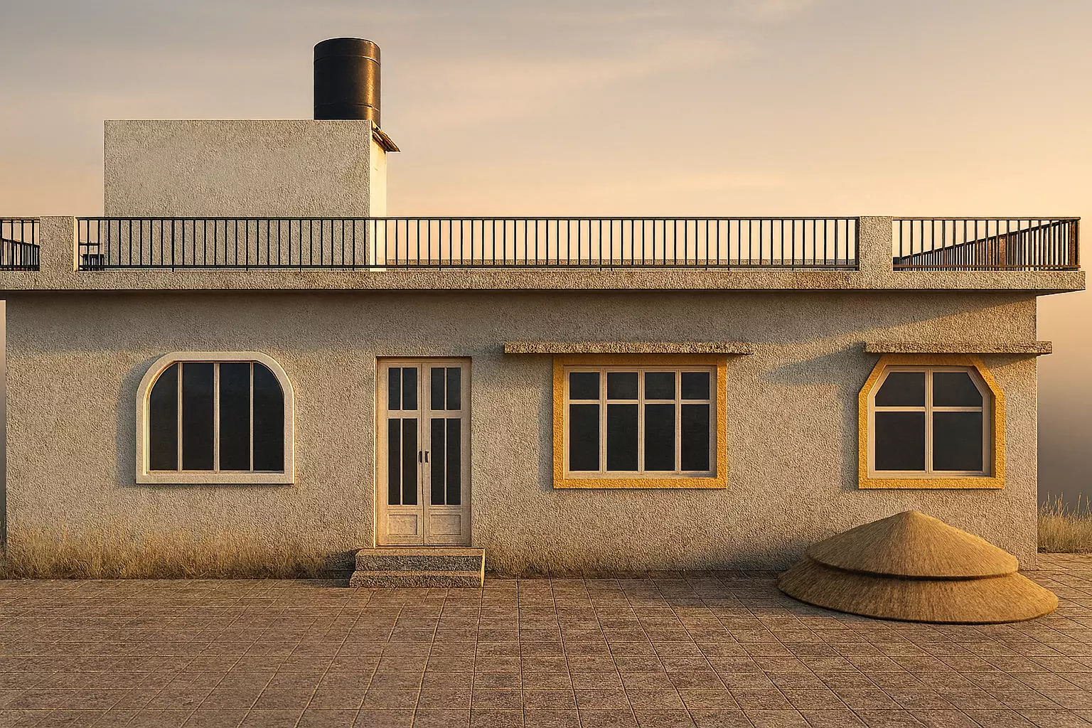 The environment features a concrete rooftop, boundary railings, a utility room with a corrugated roof, tiled flooring, and a water tank, all enhanced with sunset lighting to create a cinematic and realistic mood.