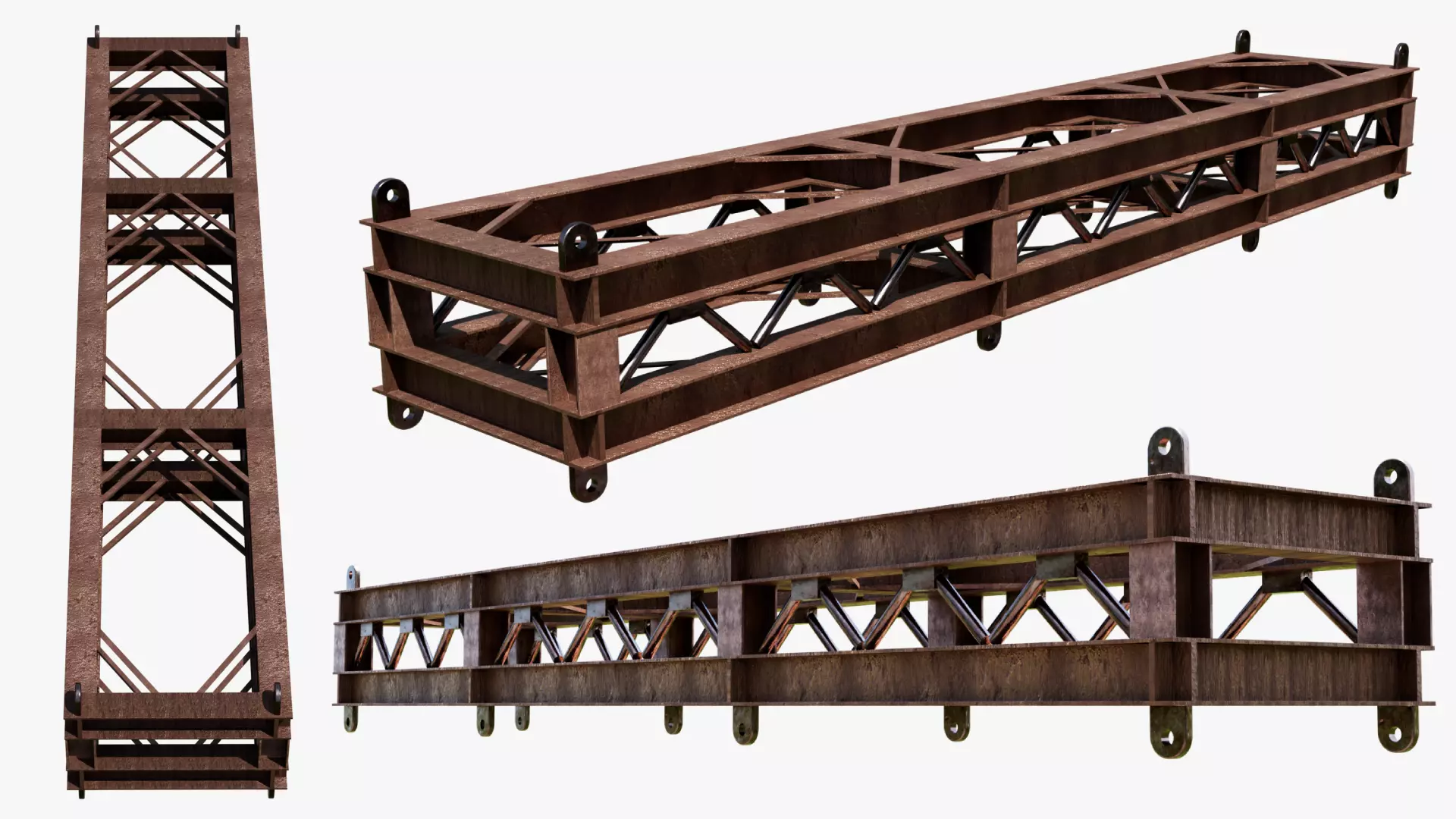 This high-quality 3D model features a rectangular steel truss structure with detailed cross-bracing lattice design and circular mounting holes at each corner for realistic assembly. The surface is textured with corroded, reddish-brown rust, making it ideal for industrial, architectural, or post-apocalyptic environments.