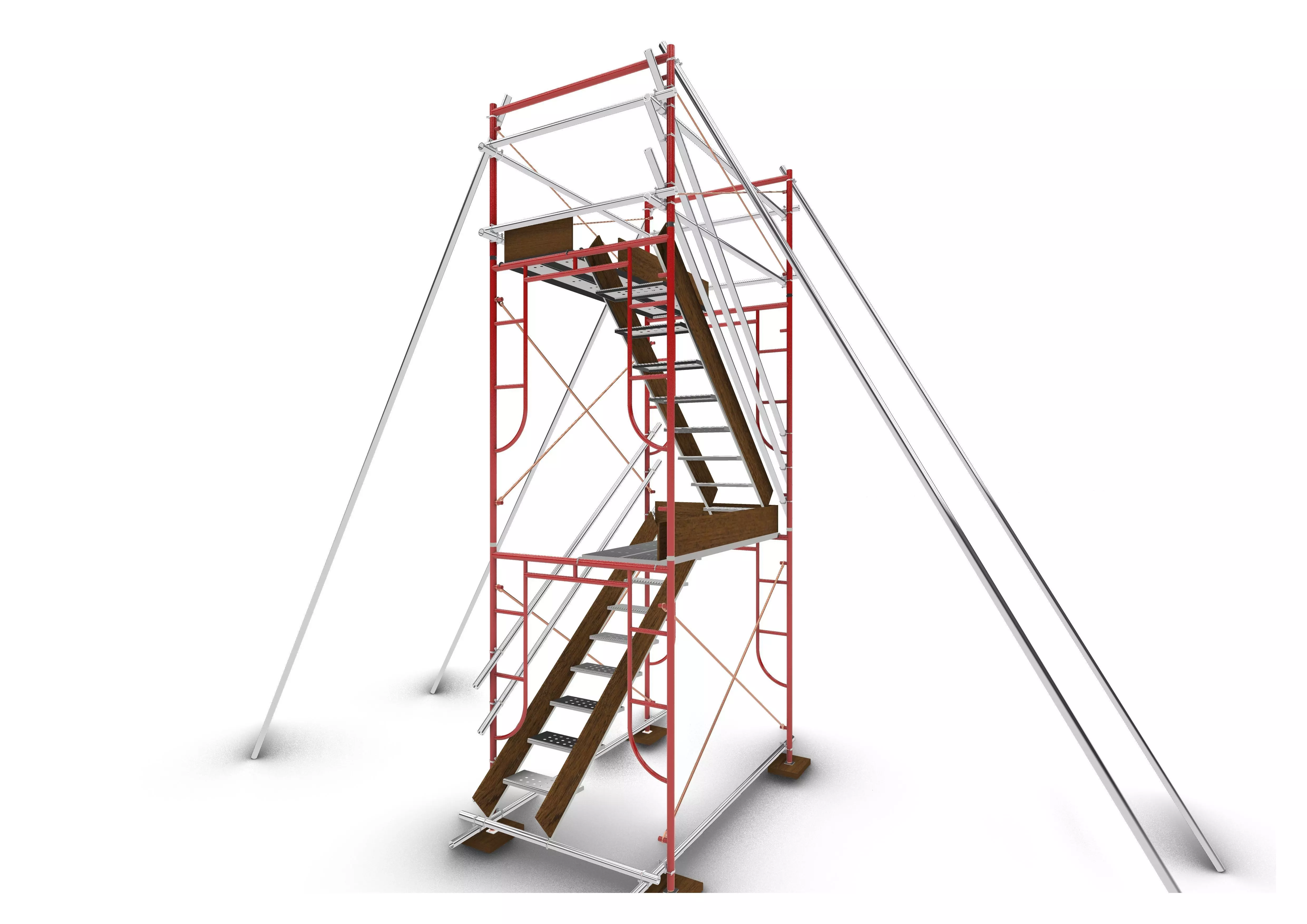 This 3D model represents a scaffolding access tower equipped with a staircase, working platform, guard rails, and stabilizing outriggers. The structure is designed for safe access to elevated work areas commonly used in construction sites, industrial maintenance, and building inspection tasks.