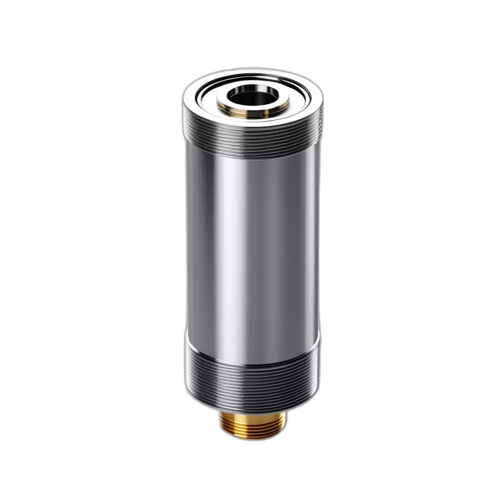 This highly detailed 3D model represents a versatile cylindrical industrial component. It has been meticulously crafted to resemble a filter housing, a specialized connector, or a sensor body. The model features a polished metallic silver finish, exuding a professional and realistic aesthetic. Finely modeled threading is present at both ends of the cylinder. A distinctive brass-colored threaded connector is located at the bottom, adding visual contrast and functional fidelity. The top opening also showcases intricate internal detailing, enhancing its realism. This asset is exceptionally suitable for a wide array of applications. These include high-fidelity architectural visualization, precise engineering simulations, and compelling product design renders. It's also ideal for immersive virtual reality (VR) or augmented reality (AR) experiences. Furthermore, it can serve as a sophisticated prop within game environments or for educational demonstrations requiring realistic industrial elements. Optimized for static renderings and high-quality visualizations, its clean topology ensures seamless integration into any scene. With minor poly reduction, it can be readily adapted for real-time applications. The asset comes fully UV unwrapped and includes high-quality PBR textures for realistic material representation. Supported file formats include GLB, OBJ, STL, ABC, DAE, FBX, USD, and PLY, ensuring broad compatibility across various 3D software and engines.