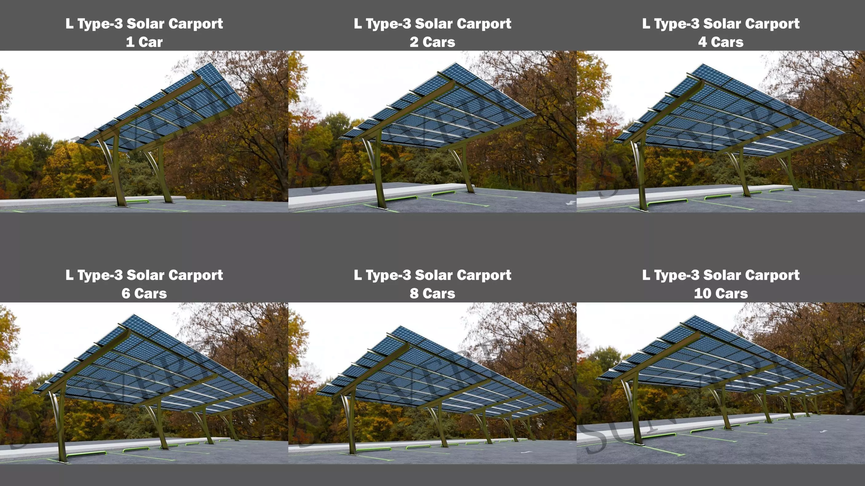 A single model containing 1-car, 2-car, 4-car, 6-car, 8-car, and 10-car solar carport models.