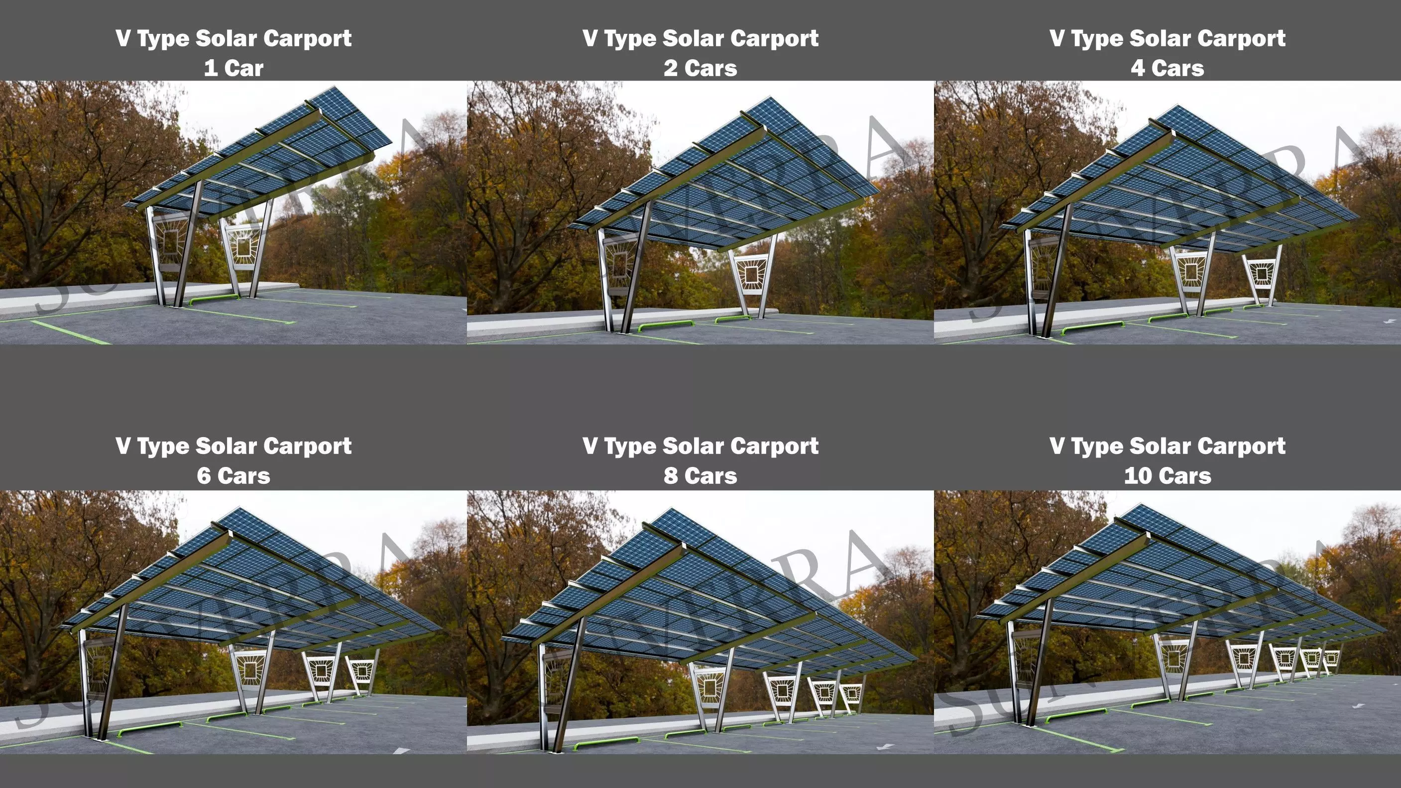 A single model containing 1-car, 2-car, 4-car, 6-car, 8-car, and 10-car solar carport models.