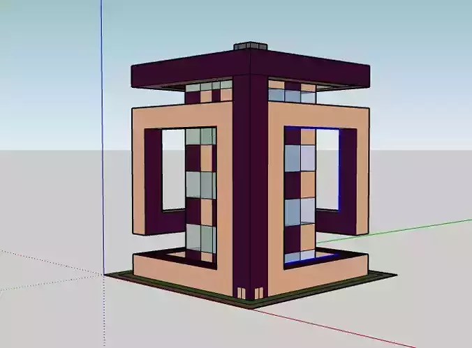 A cube is formed starting from one point and ends up on the top. One see the design form into square from the ground level and the move upwards to form vertical squares.All four sides are fored into squares and lastly one on the top. A tower building is inserted within this formed magical cube and so I named it Magical Cube Tower.
