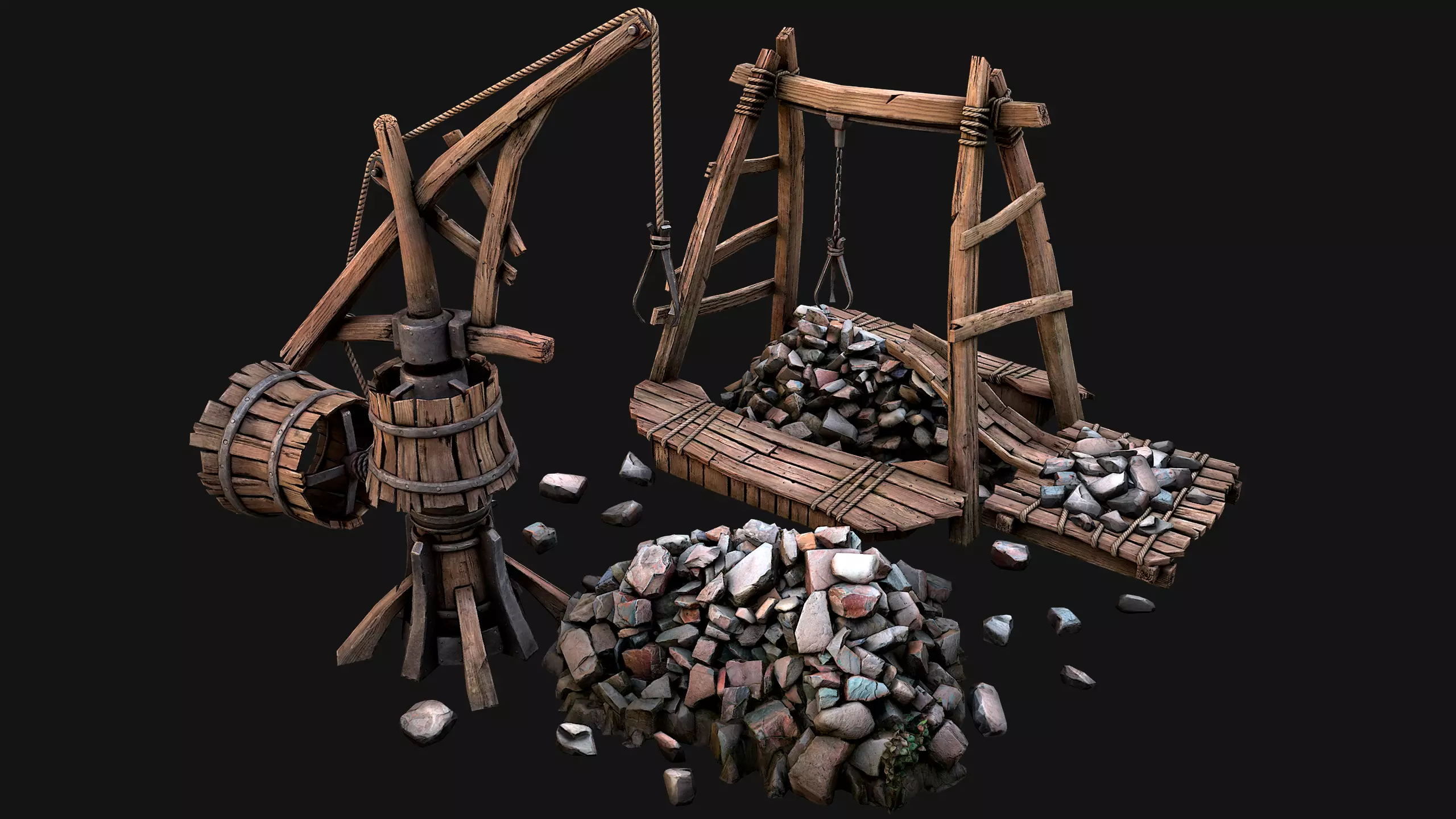 Game ready models Pack.Stylized and detailed Medieval Quarry Mine with Crane Pack fully textured, sculpted and rendered with Physical based rendering (PBR) - Shown images have been rendered in Marmoset Toolbag .The models contains lods, detailed information on the images.The set contains: Crane, Quarry, Pile of stones, 16 models of stones.