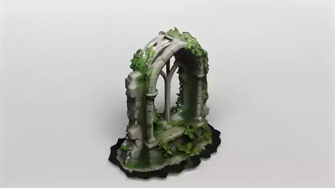 This highly detailed 3D model depicts a medieval ruined window arch, crafted in the Gothic architectural style. The arch features pointed windows and intricately modeled stonework, with realistic cracks and weathering that suggest centuries of exposure to the elements. Climbing vines and lush greenery wind through the structure, adding a sense of life and nature reclaiming the ruin.The model is meticulously textured, with a high-resolution texture map included to enhance the realism of the stones and foliage. The weathered stone surface and the organic growth of the vines have been carefully crafted to provide a natural, immersive appearance suitable for close-up renders or as a dramatic environmental asset in larger scenes.This asset is perfect for use in fantasy or historical environments, such as abandoned castles, ancient ruins, or mystical landscapes. Its modular design allows for easy integration into a wide range of projects, from video games to architectural visualizations and cinematic animations.The model is available for download in gmb format, with the texture included for immediate use. Additionally, it is also provided in fbx format, ensuring compatibility with most major 3D software packages and game engines. This makes it a versatile and ready-to-use asset for your creative workflows.