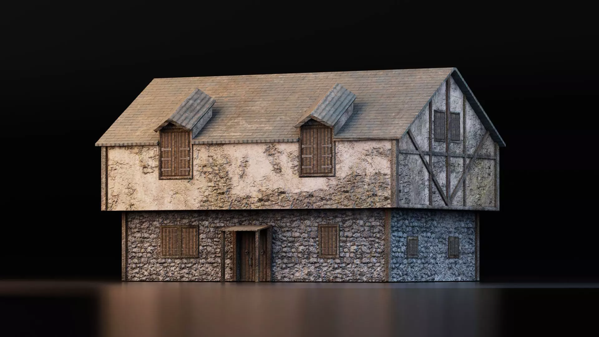 The roof consists of aged shingles, subtly irregular and weathered for added authenticity. Two upper-level window extensions break up the silhouette, adding depth and visual interest. Wooden shutter windows, iron details, and natural imperfections help create a truly believable environment asset.