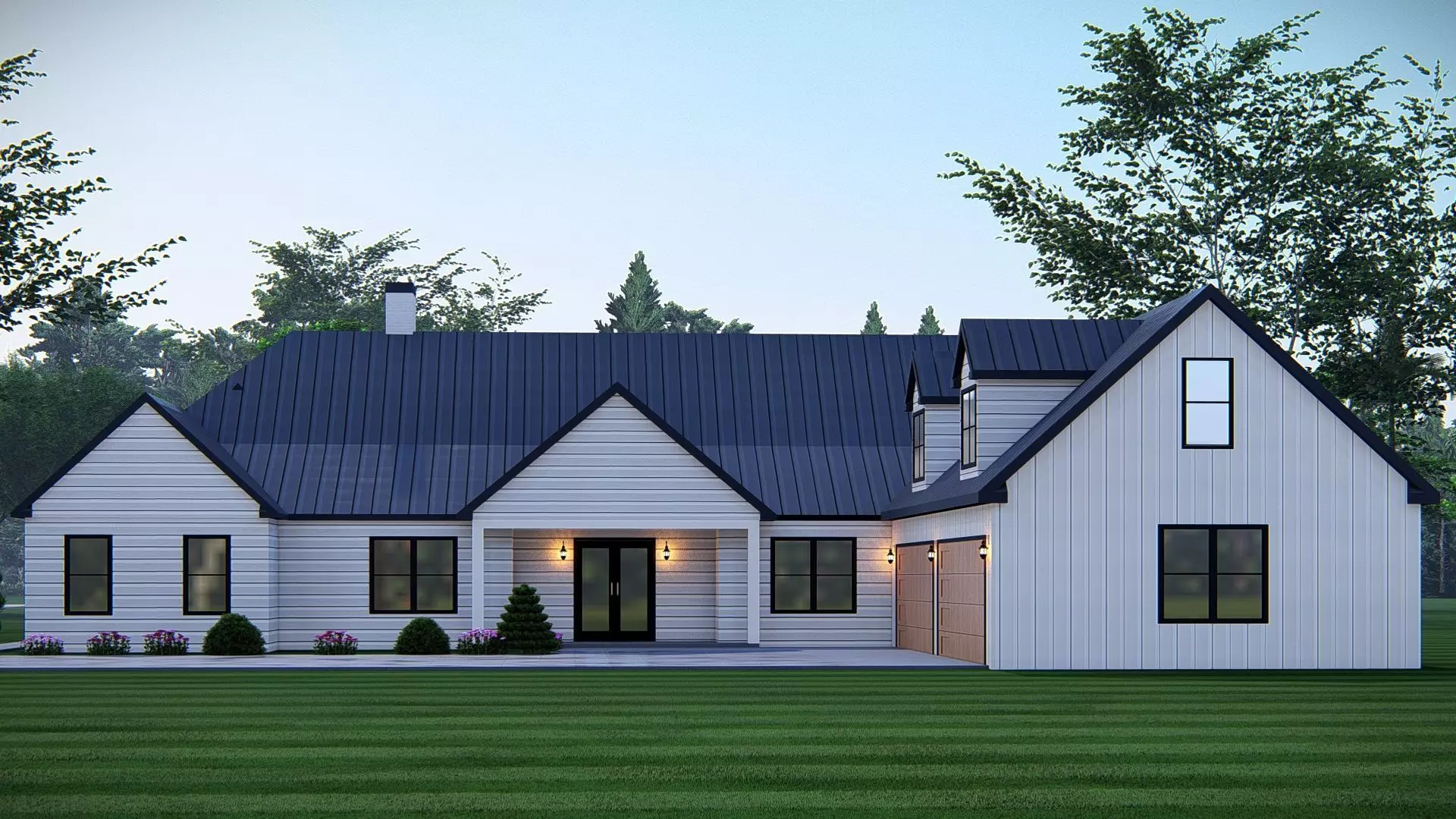 This modern American farmhouse 3D model showcases a beautifully detailed single-story home design, perfect for architectural visualization, rendering, and real estate presentations. The house features a sleek black metal roof paired with white horizontal siding, creating a clean and timeless American look. Large black-framed windows add a modern touch, allowing for natural light and enhancing the home’s visual appeal.