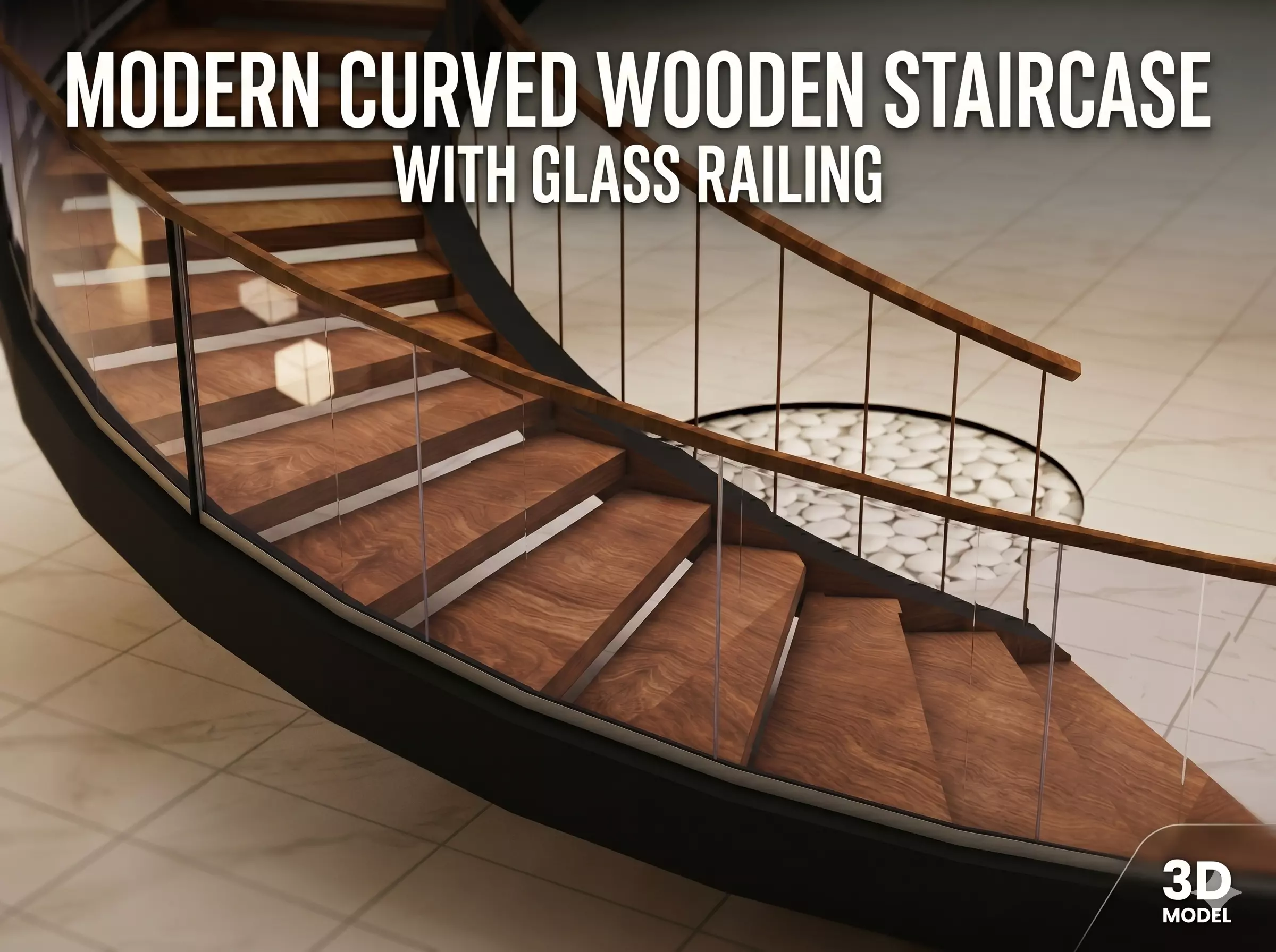 Materials: Rich, textured wooden treads and a matching wooden handrail paired with a sleek, dark structural stringer.Railings: Clear, modern glass balustrades that allow for an open, airy feel, complete with an upper-floor gallery railing enclosure.Base Detail: Features a built-in decorative bed of white river pebbles at the base of the stairs, adding a natural, biophilic touch to the interior space.Technical Details