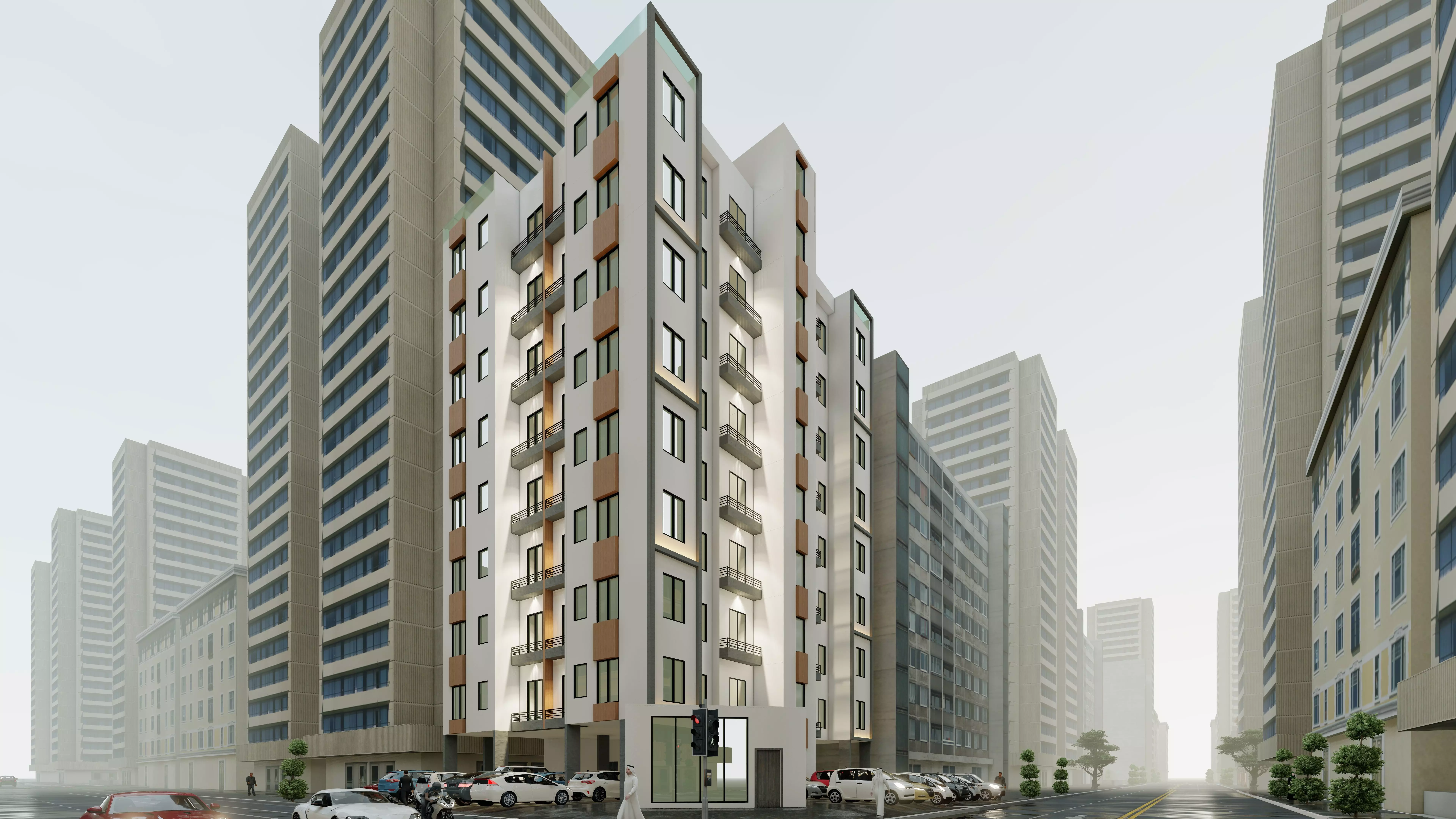 This is a premium-quality 3D model of a modern residential apartment building, designed by a professional architect using 3ds Max 2021.