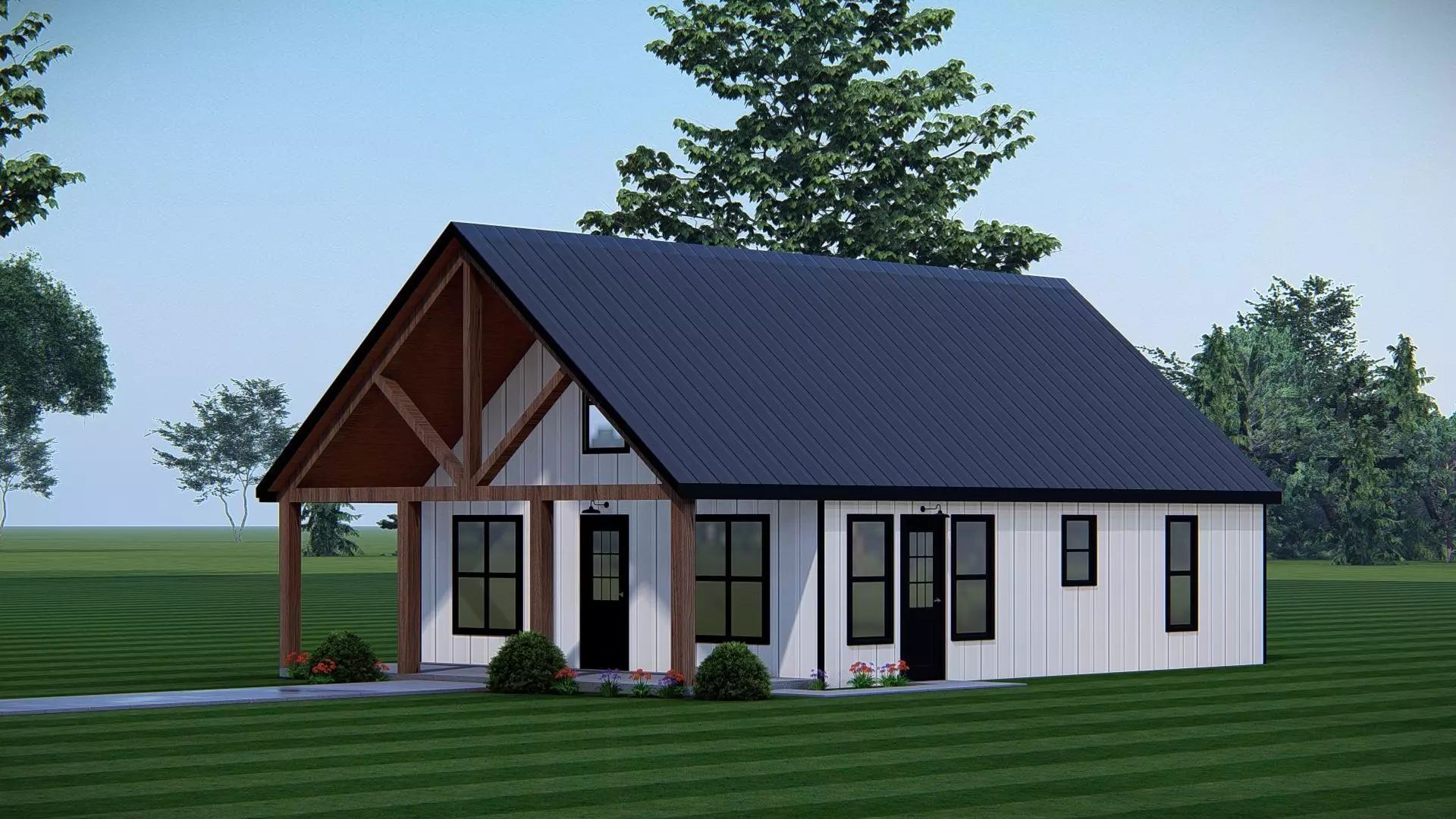 This high-quality 3D model showcases a Modern Tiny American Farmhouse designed with clean architectural detailing and realistic materials. The structure features a single-story layout with a steep black metal gable roof, complemented by white vertical board-and-batten siding and warm natural wood accents. The covered front porch includes timber beams and supports that enhance the farmhouse character.