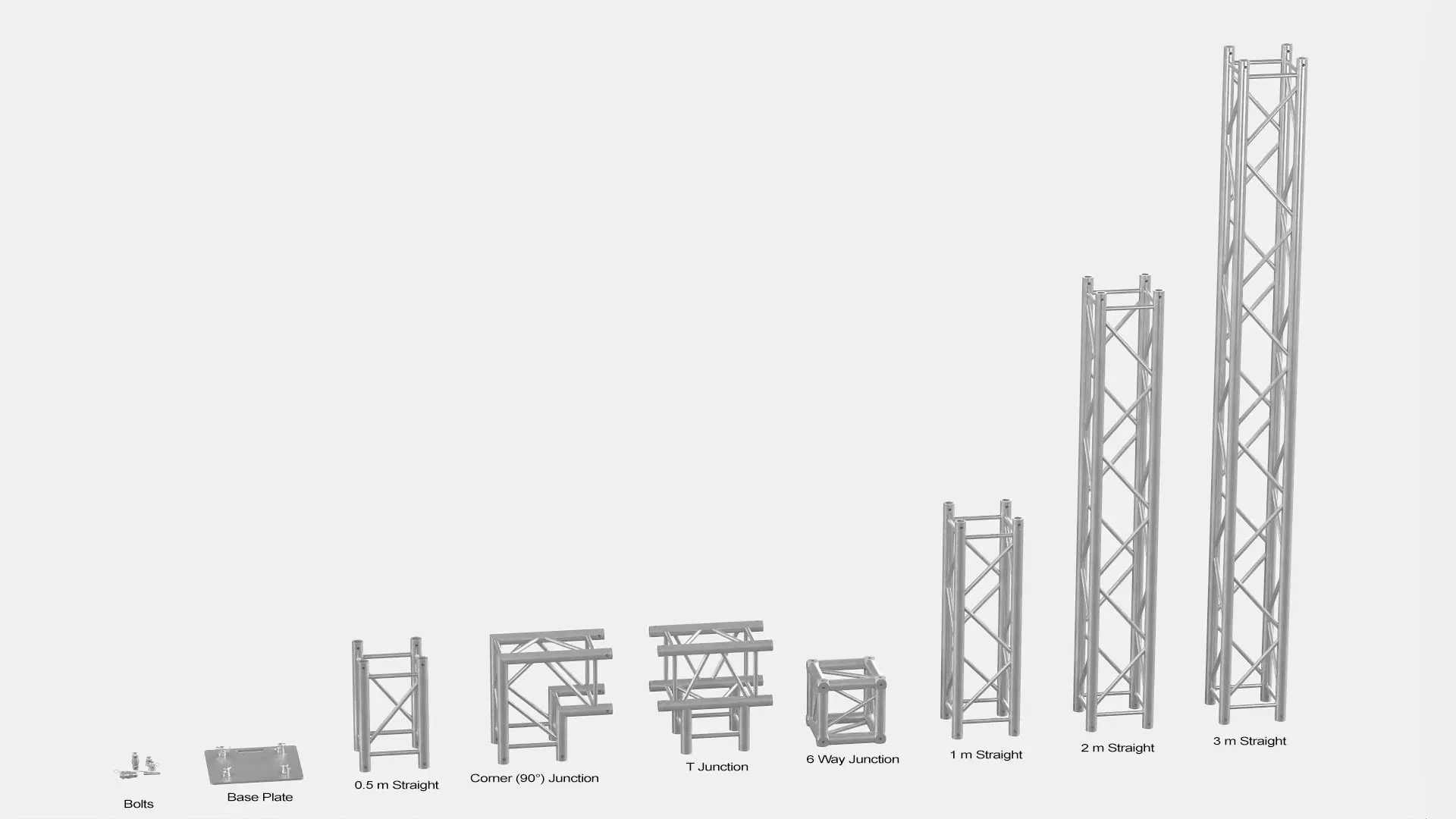 High-quality modular square truss system with realistic aluminum and black materials. Includes straight sections, corner and junction modules, base plates, and connectors. Designed for easy assembly into stages, entrances, frames, and exhibition structures. Clean topology, consistent scale, and production-ready for visualization, events, and architectural scenes.All parts share consistent real-world scale, clean topology, and optimized geometry for smooth performance. The system is easy to assemble, highly reusable, and suitable for close-up renders as well as large-scale scenes.
