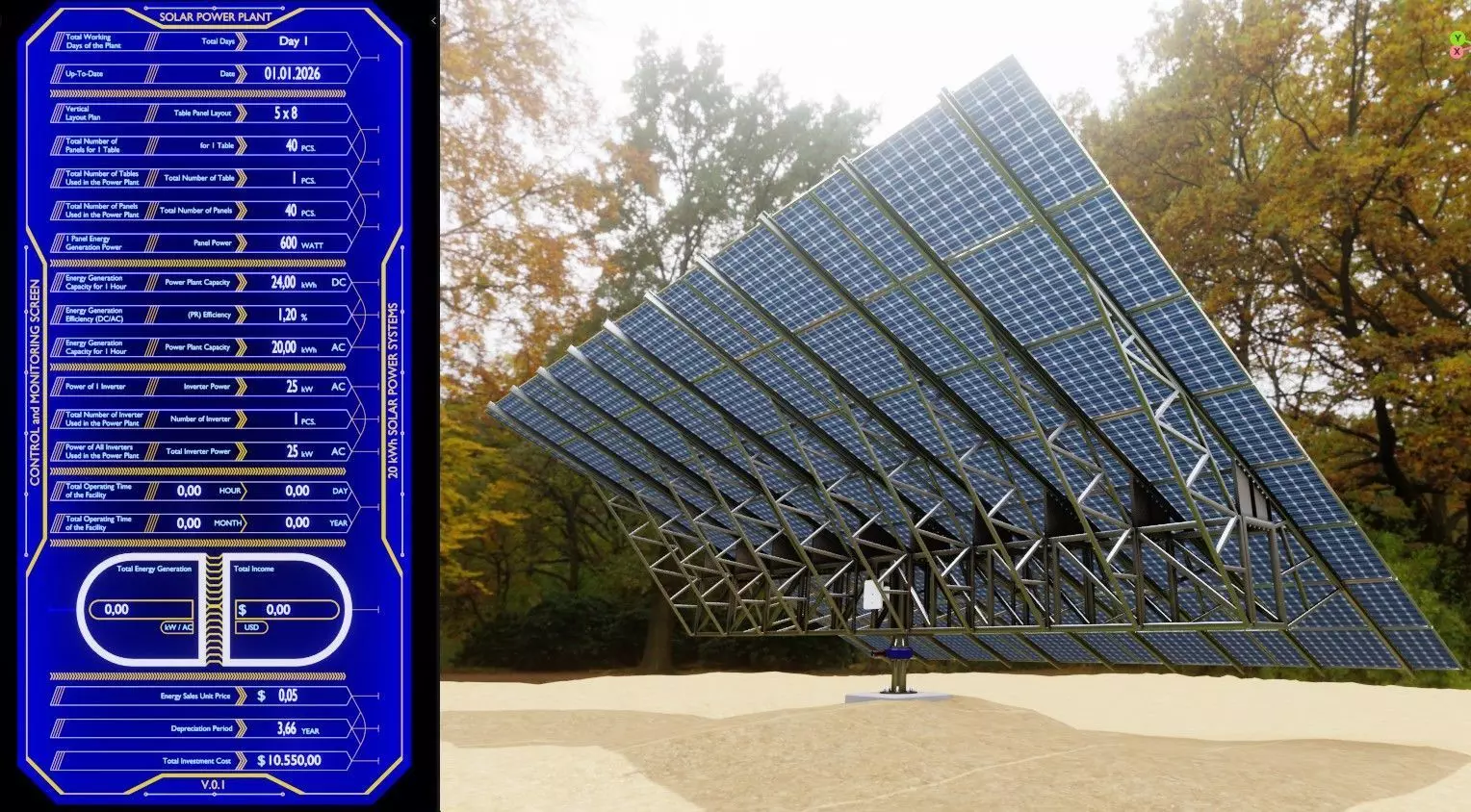 A Python script code has been prepared in Blender to simulate energy production during the day. When the timeline is played, energy production is simulated between 8:00 a.m. and 4:00 p.m. A monitoring screen has been modeled to display the technical data of the power plant, and the technical information has been adapted to the screen in text form.