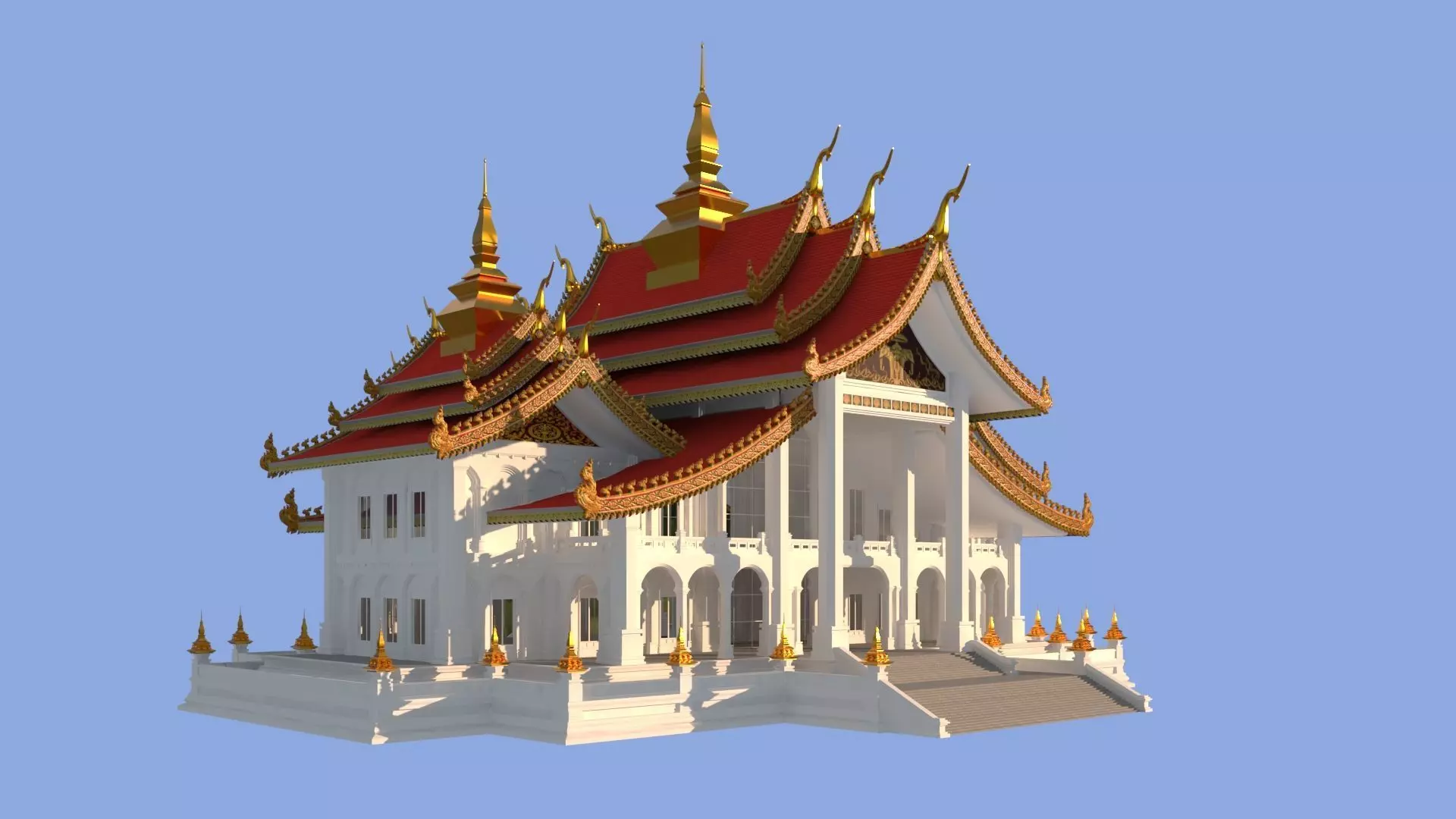 Welcome to experience this extremely detailed 3D model of a luxury Southeast Asian - style hotel! This model is created with high - precision modeling, containing 1,997,164 polygons and 2,209,373 vertices, restoring the magnificent temperament of traditional Southeast Asian architecture with ultimate details. The main body of the building uses pure white with striking red - and - gold two - color roofs. The multi - layer spire structure, golden carved decorations and transparent glass doors and windows complement each other brilliantly, perfectly integrating elegant and luxurious styles.The model supports FBX, OBJ, and MAX formats. It is optimized with the V - Ray 6 Update 1.2 renderer for 3ds Max 2021, presenting realistic light, shadow and material effects. The wiring adopts a mixed topology of triangles and quadrilaterals, and the UV is a mixed layout, ensuring that the model can be used efficiently in various scenes and renderers. It is suitable for hotel visualization, resort projects, game scenes, architectural presentations, and Southeast Asian - style film/animation production, bringing you an immersive tropical style experience!