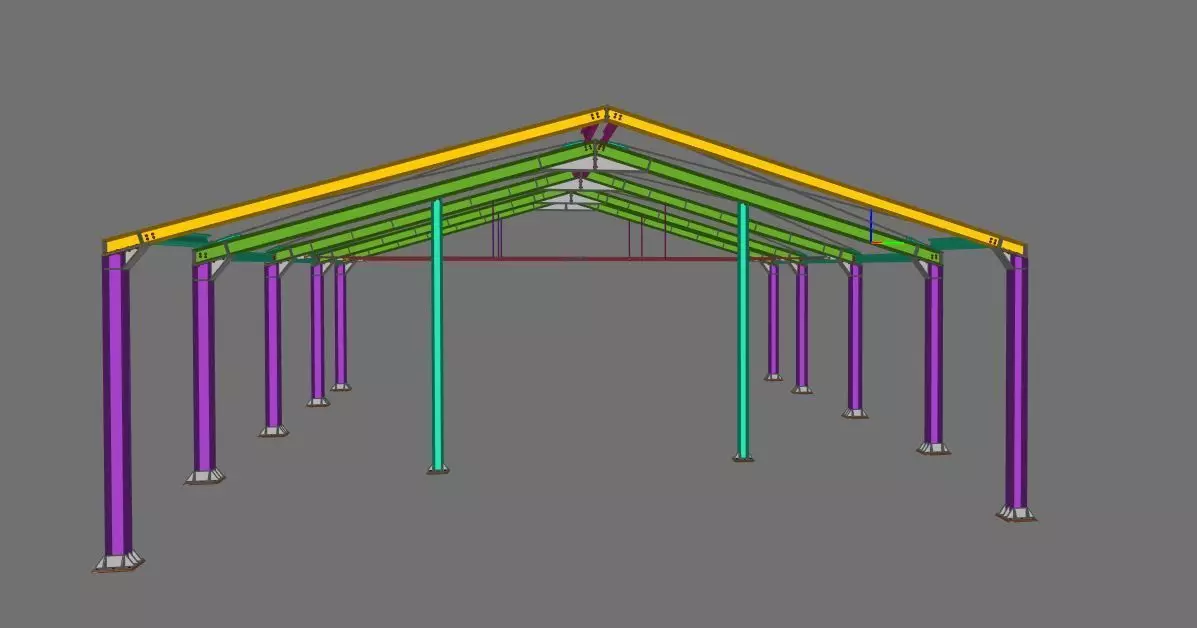 This model represents a detailed steel canopy structure, suitable for architectural and structural engineering use. The model includes beams, columns, bracing, and base plate elements, designed using Tekla Structures, BIM methodology and exported in multiple formats.