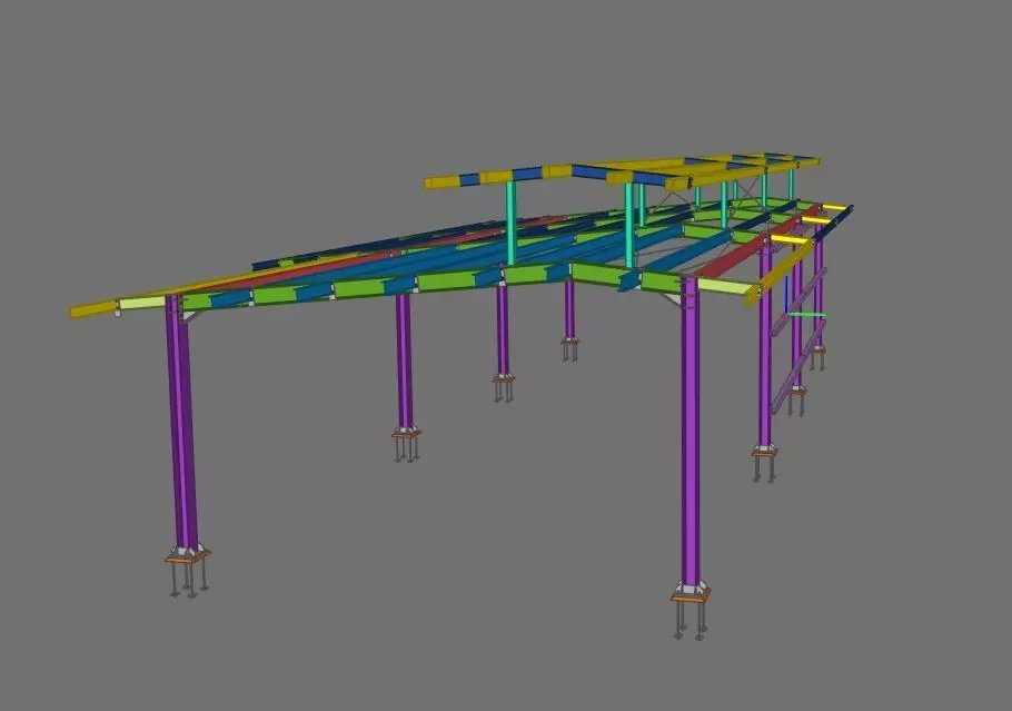 This model represents a detailed steel canopy structure, suitable for architectural and structural engineering use. The model includes beams, columns, bracing, and base plate elements, designed using BIM methodology and exported in multiple formats.