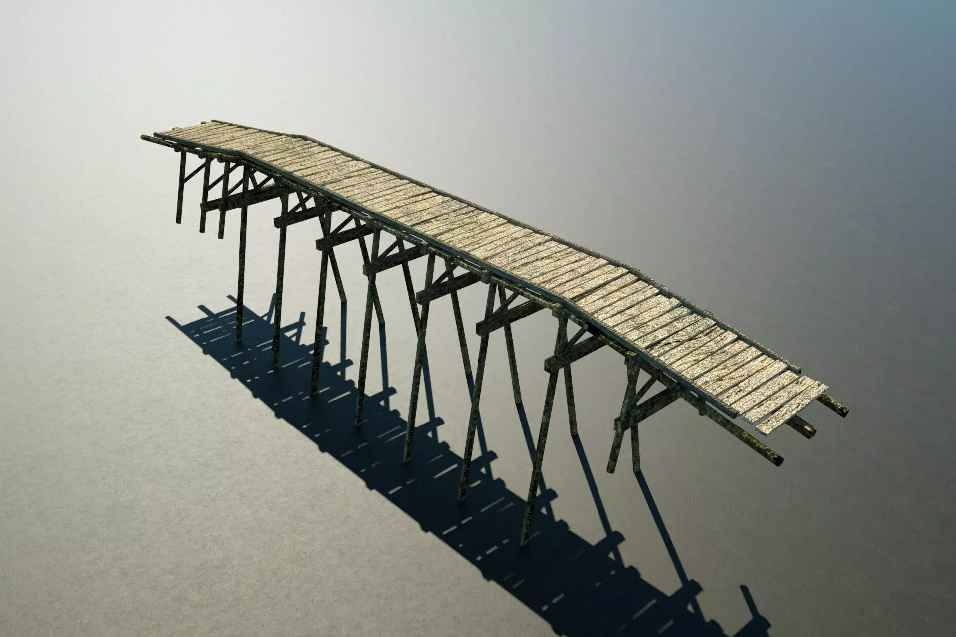 A worn river-crossing timber bridge, of the type the Roman empire would likely have constructed to temporarily allow their legions movement across water. While a simple model with even simpler texturing, this could provide a quick and believable gateway to adding a timber bridge to a scene. Comes fully optimised and mapped with basic textures.