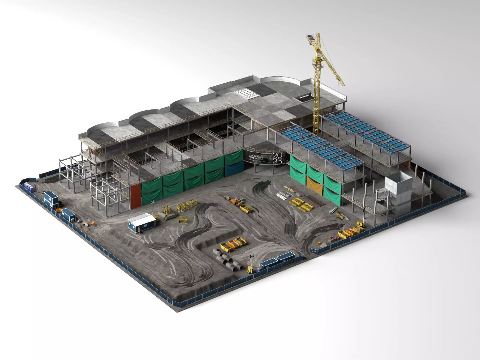 This asset pack includes a complete modular construction site environment with detailed buildings, scaffolding structures, safety fences, containers, equipment and ground props.