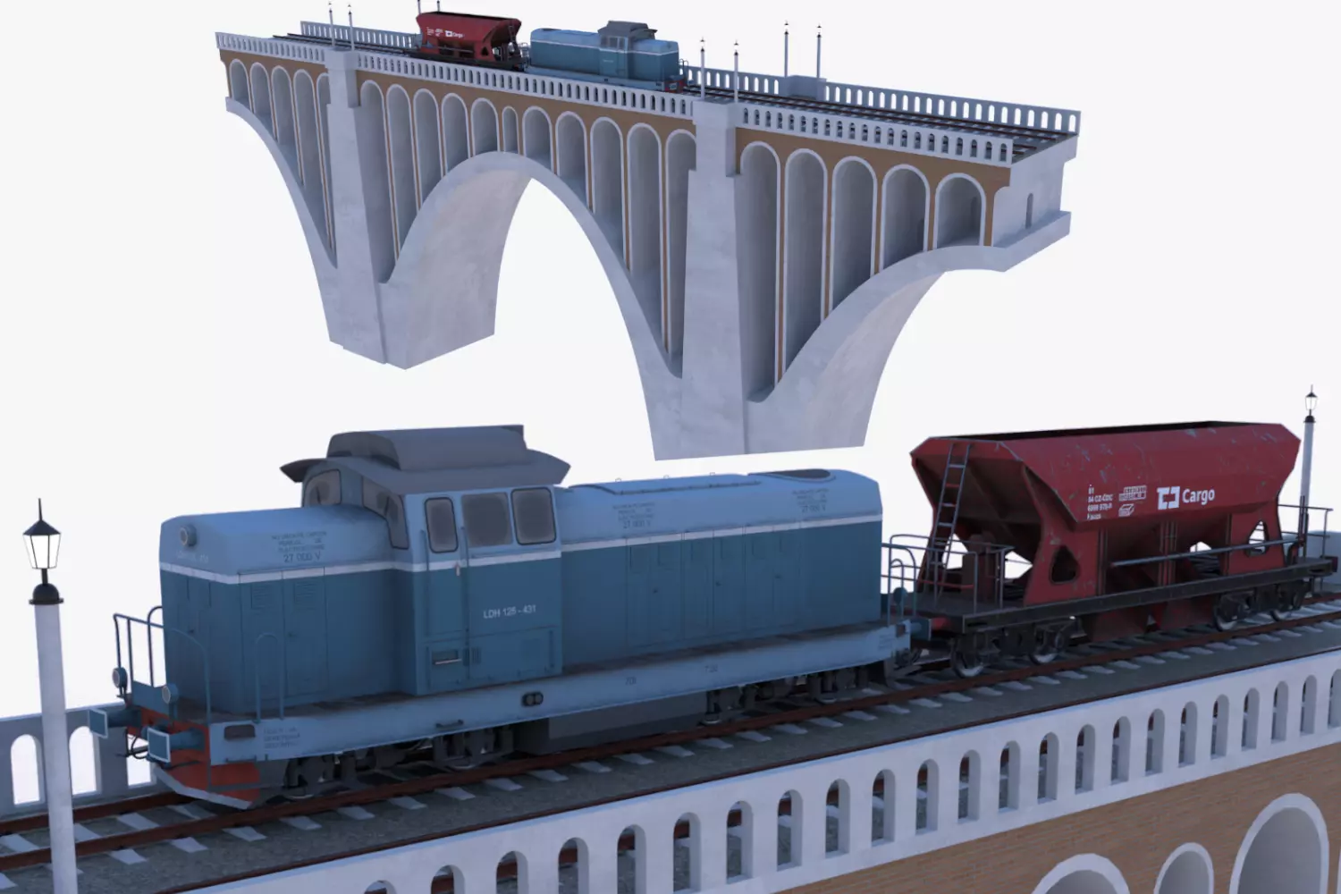 • This is 3D model of viaduct with locomotive Faur LDH-125 and cargo wagon of type Faccs.